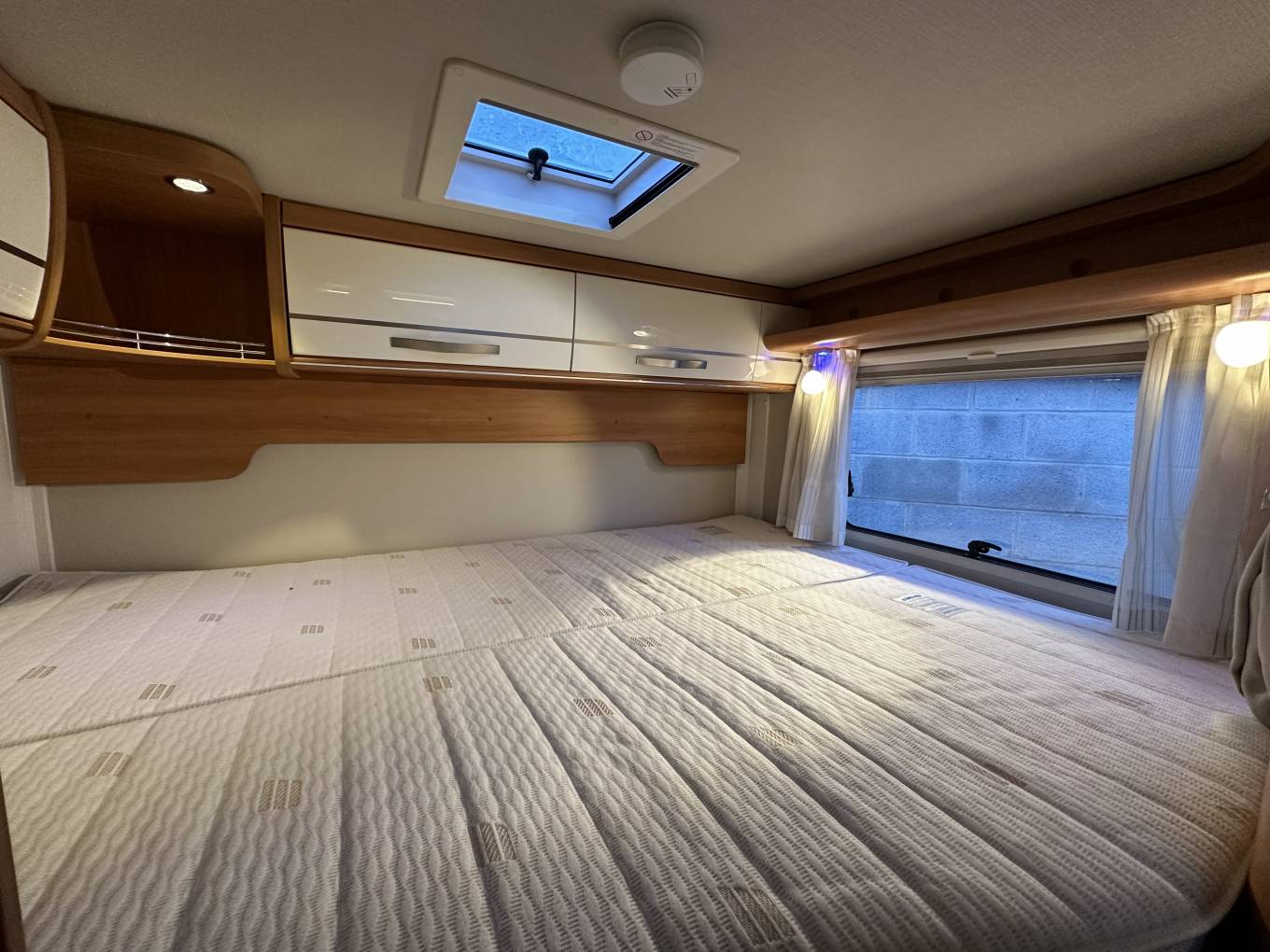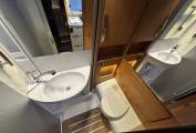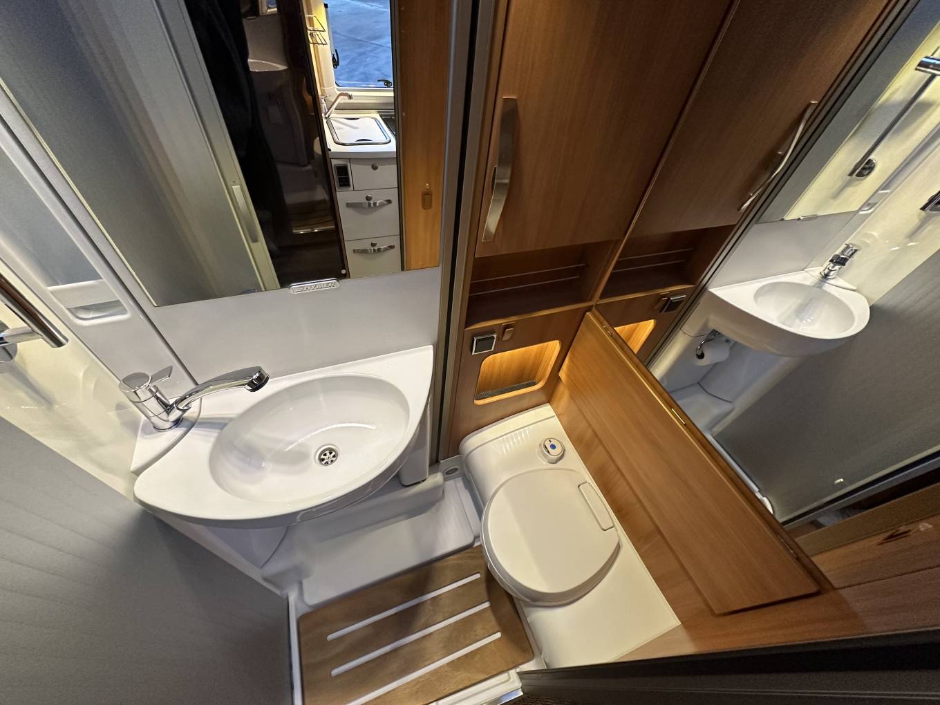 A large double transverse bed is located at the rear of the motorhome, with a split memory foam mattress to help provide a more restful night’s sleep. The washroom, in chrome and white finish, has a fixed Thetford toilet, an oval sink and a shower with removeable wooden slated flooring. The Rear wall panel with Sink is hinged to pull forward to make a fully enclosed Shower Cubicle.