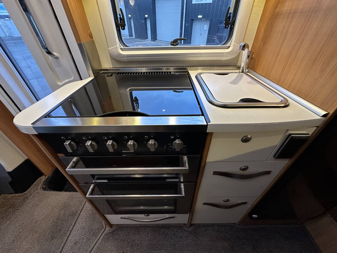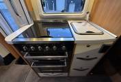 The kitchen is centrally positioned and is well equipped with a 142 litre Smart Tower Fridge which has a decent size freezer compartment, a cooker with 3 gas rings and an electric hob, a separate oven and grill and a stainless-steel sink and a pop worktop extension.