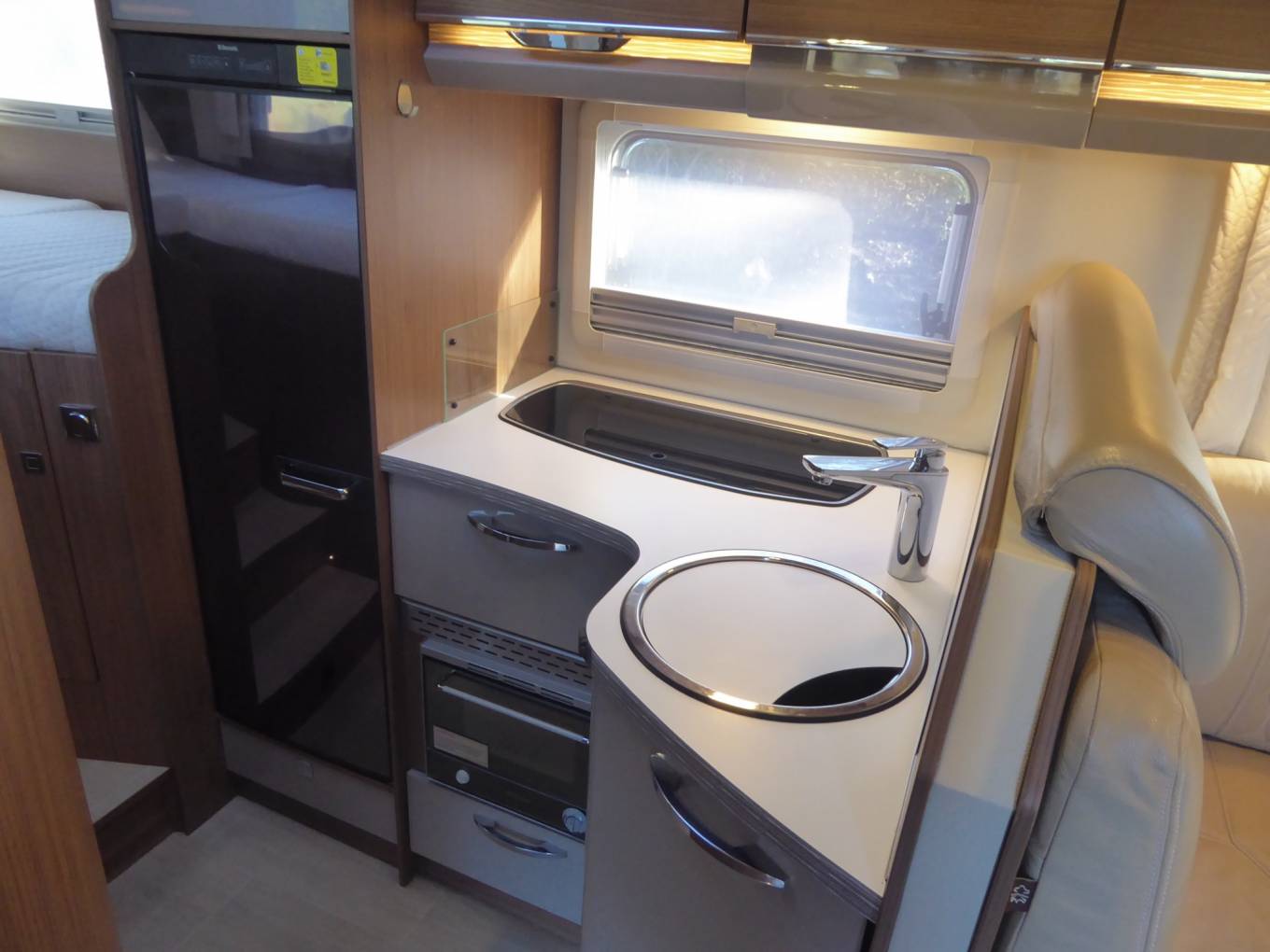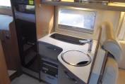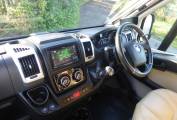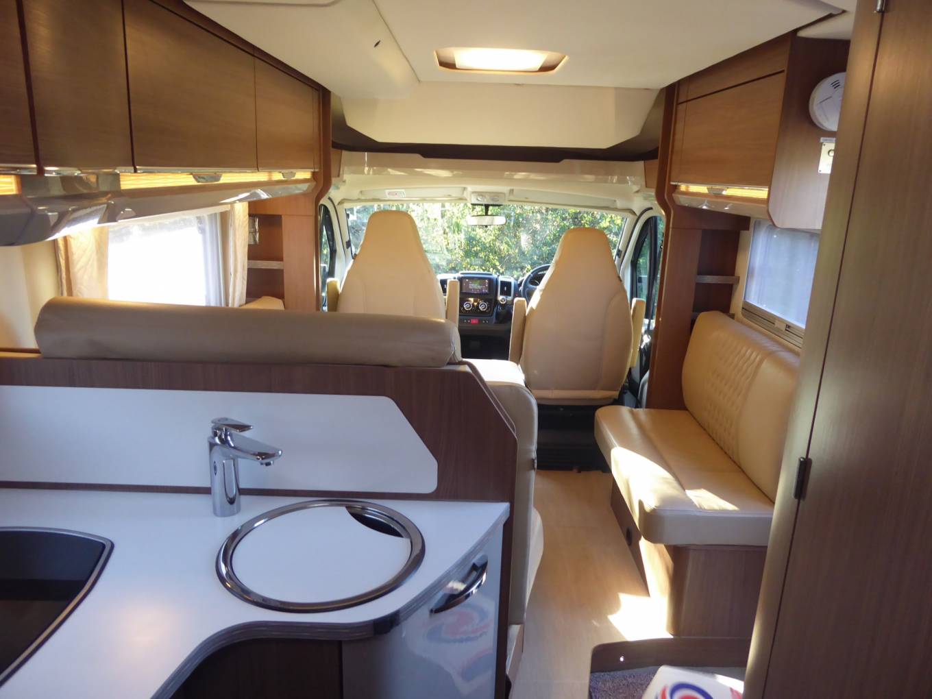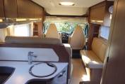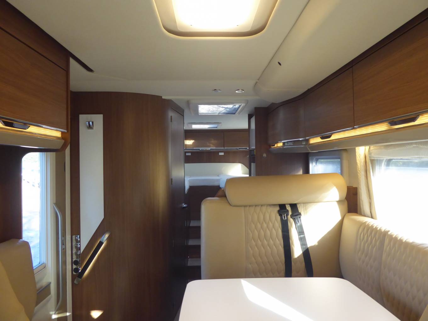 Behind the cab is forward, L-Shaped lounge with an opposing side sofa. With the swivel cab seats utilised there is space for 5-6 people to be seated around the large adjustable table.