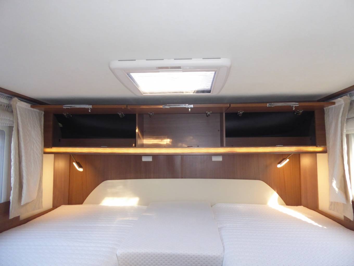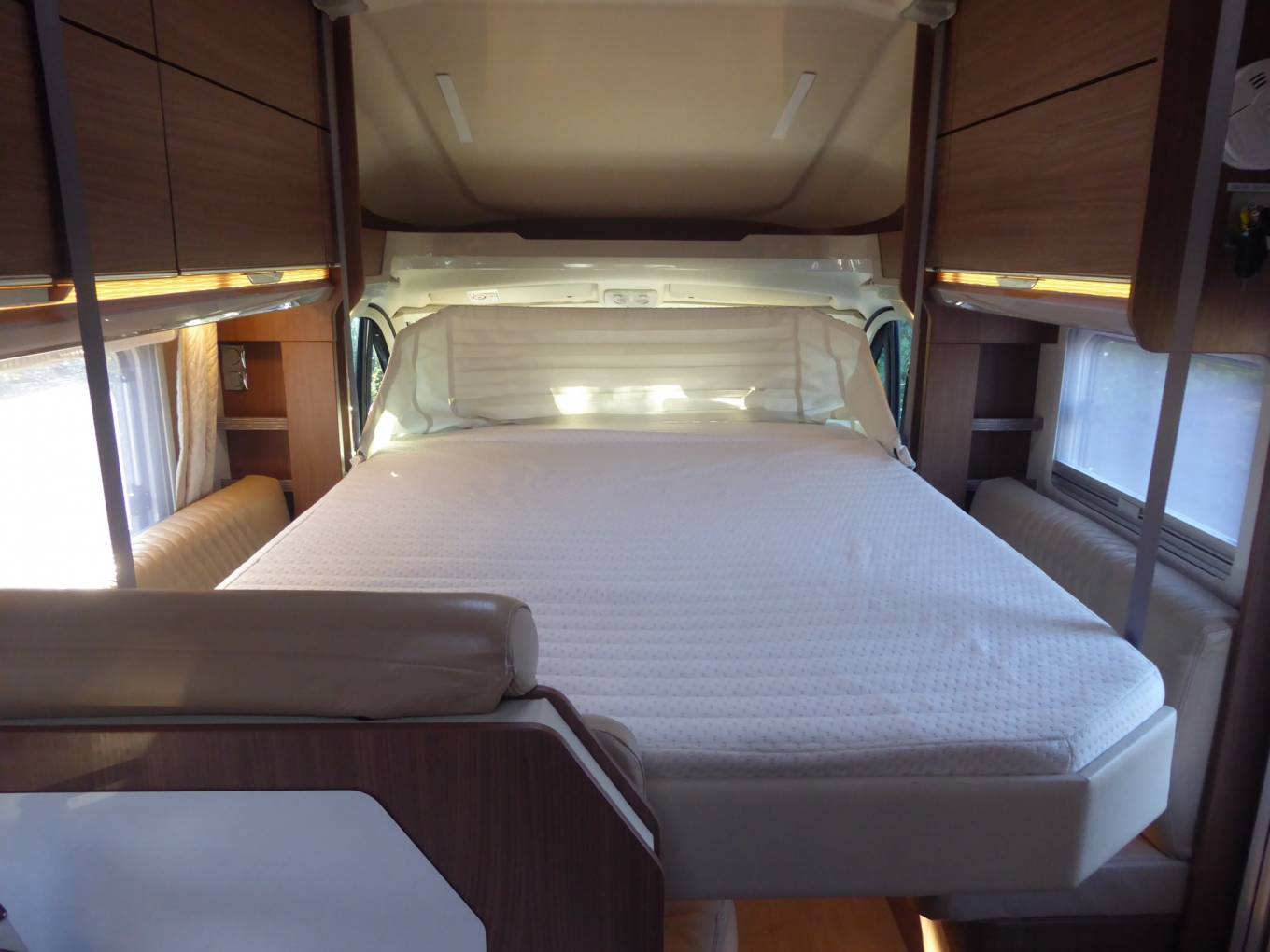 Discretely stowed in the ceiling space above, there is a large lonitudinal electronic drop down double berth.