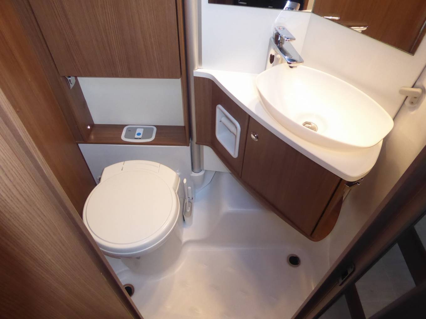 Opposite the kitchen is the offside bathroom, with a toilet, a hand basin, and a shower that can be screened into a cubicle.