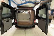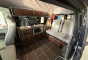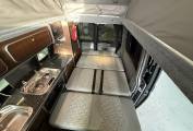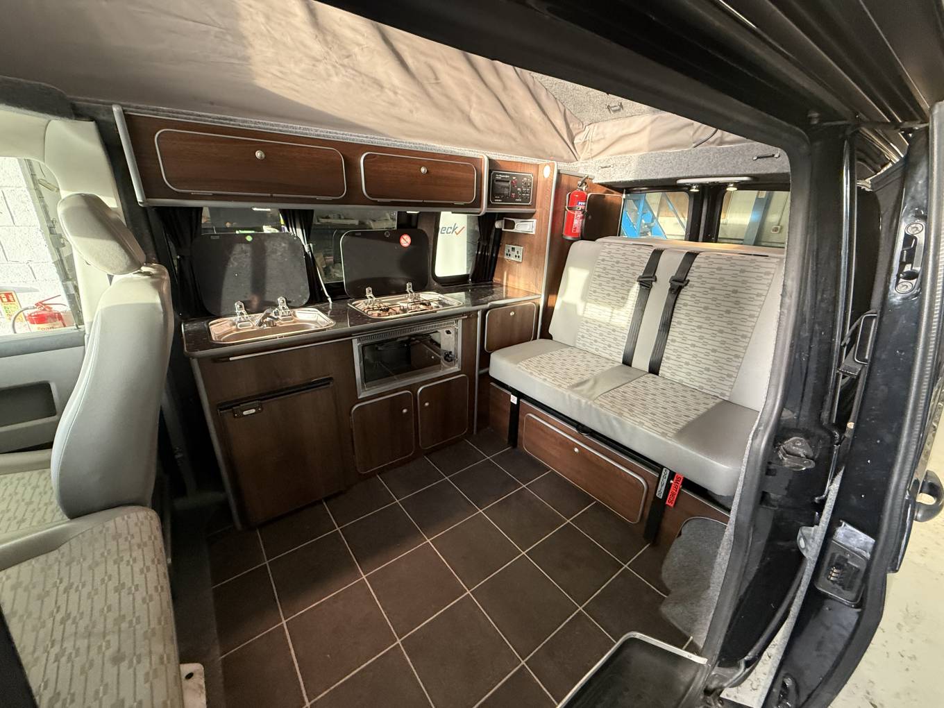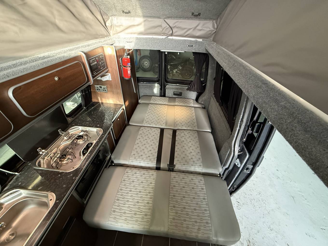 The Rock n Roll bed fitted in the rear and pop-top roof allow for 4 berths comfortably so there is plenty of sleeping space. There is a compressor fridge and a diesel heater situated in the front where there is also a fold away table to form a dinette when needed. At the back there is a kitchen with a sink and 2 gas hobs.