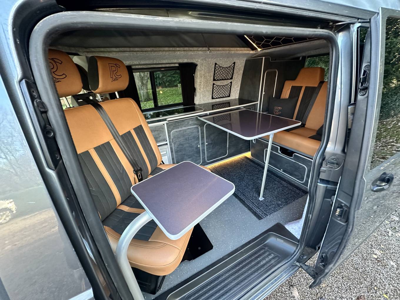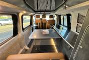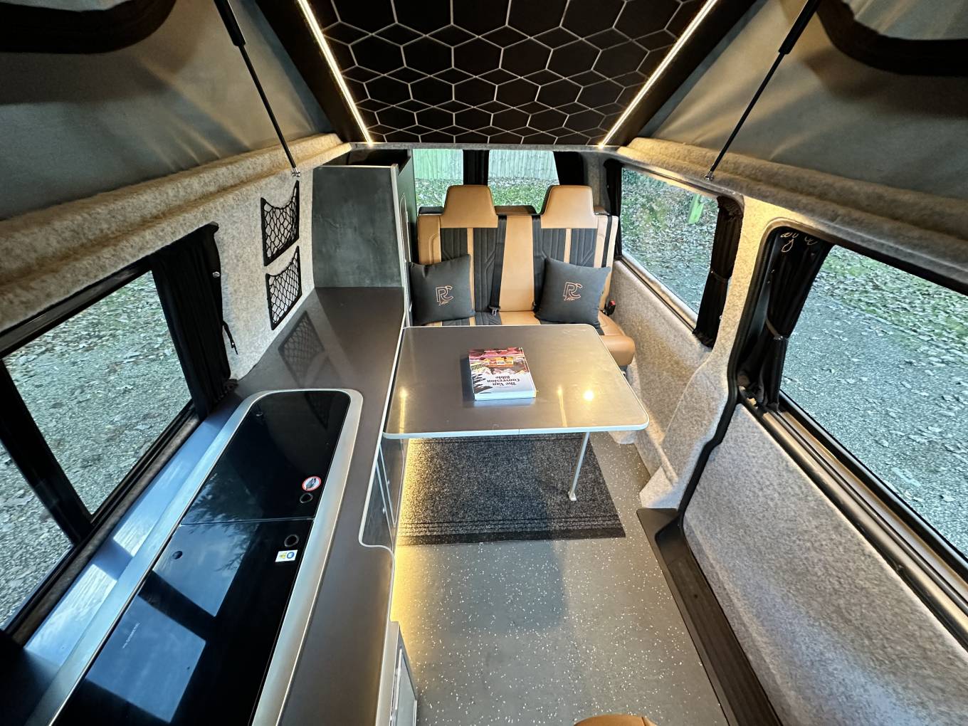 Entering through the side door we are greeted by the attractive interior with stylish grey units complimented by high gloss gre worktops. There is an abundance of storage along with a Dometic combination sink/hob and CamperCool Fridge. The rock and roll bed features two additional 3 point seatbelts and also creates a comfortable double bed. For Dining the front double passenger seat can swivel to allow four to sit around the large removable table. You will find the second sleeping area in the pop top which has a panoramic canvas giving plenty of natural light. When this is not being used it pushes up to maximise head room.