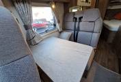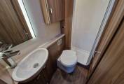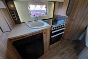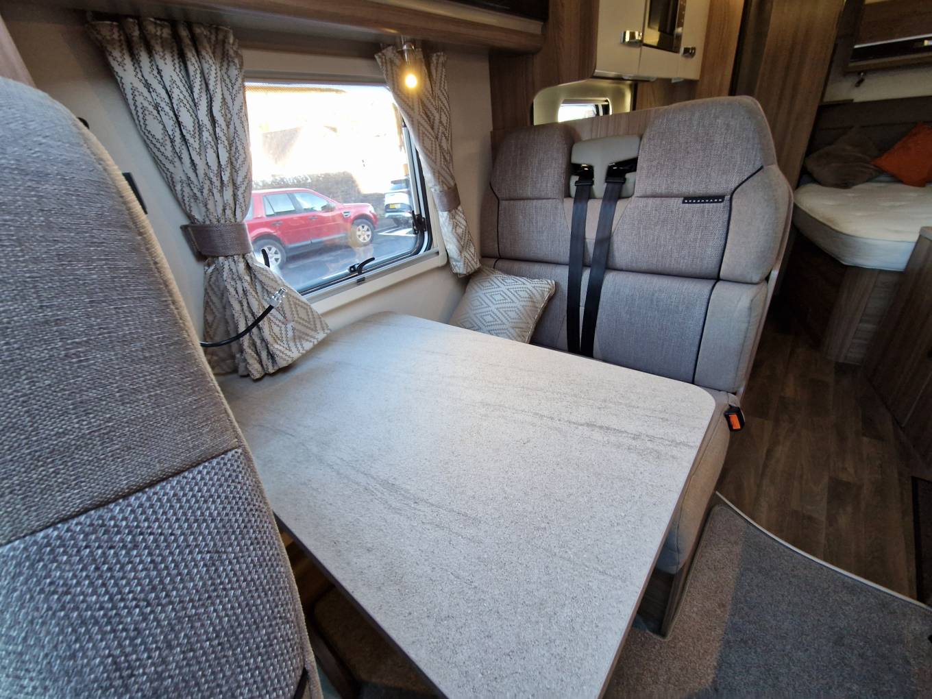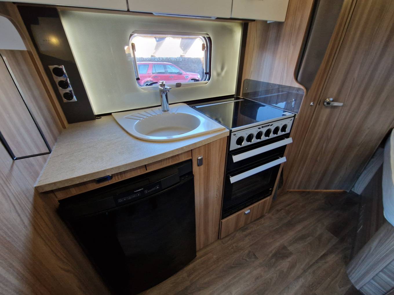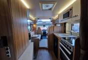 Next to the bedroom is the very elegant bathroom featuring a separate shower with a screen, a Thetford flush toilet, a wash basin with mixer tap, a mirror and generous cupboard space to store your toiletries. As you exit the bathroom you come to the centrally located kitchen which has everything a budding chef needs to rustle up a culinary delight. There is a microwave, an oven and grill, a dual fuel hob with 3 gas burners and an electric hotplate, a 3 way 110 litre Dometic fridge freezer with auto setting, a sink with mixer tap and lots of cupboard space to store utensils and ingredients. A skylight above the kitchen provides plenty of natural light to prepare your food.