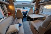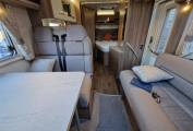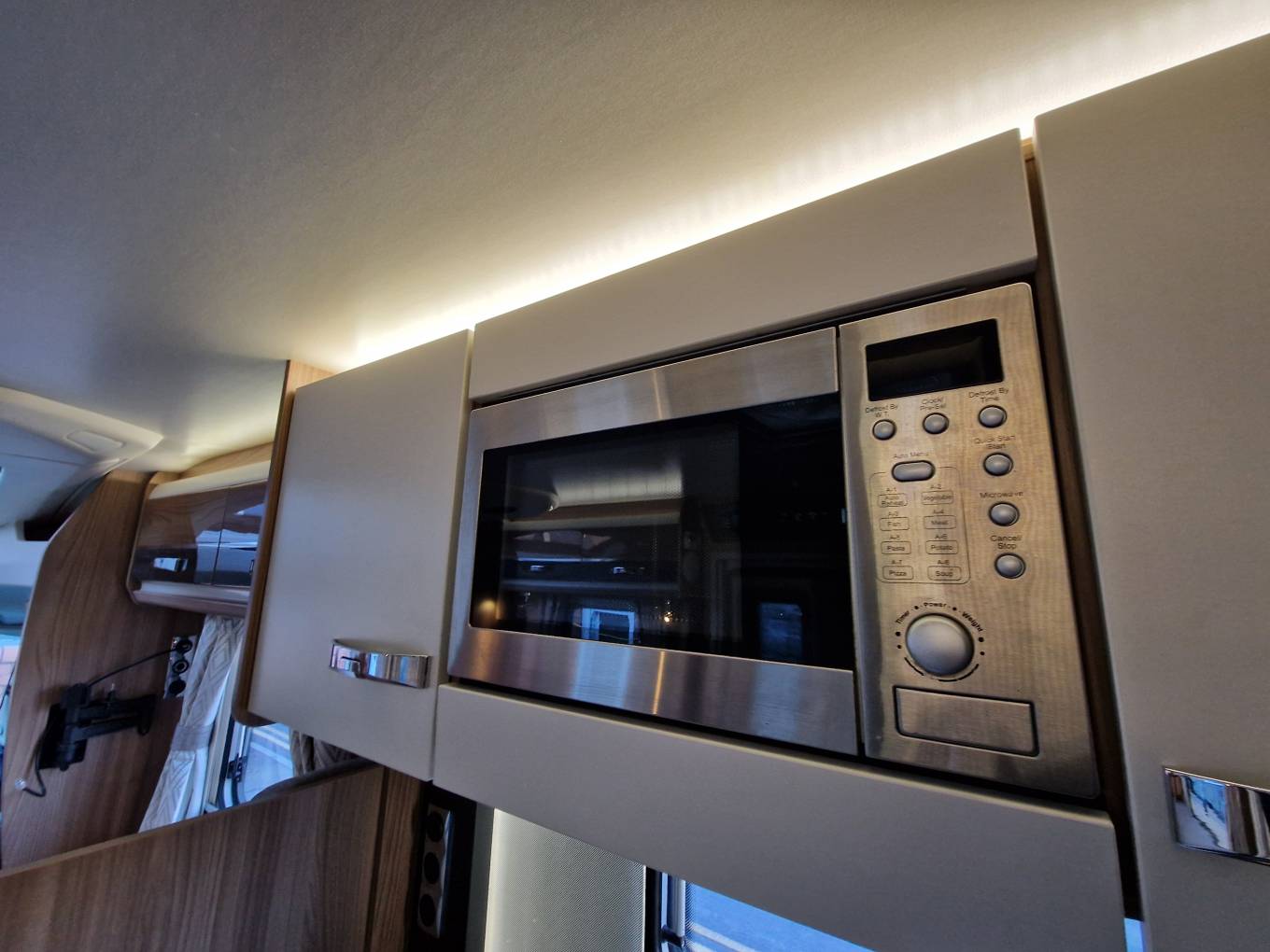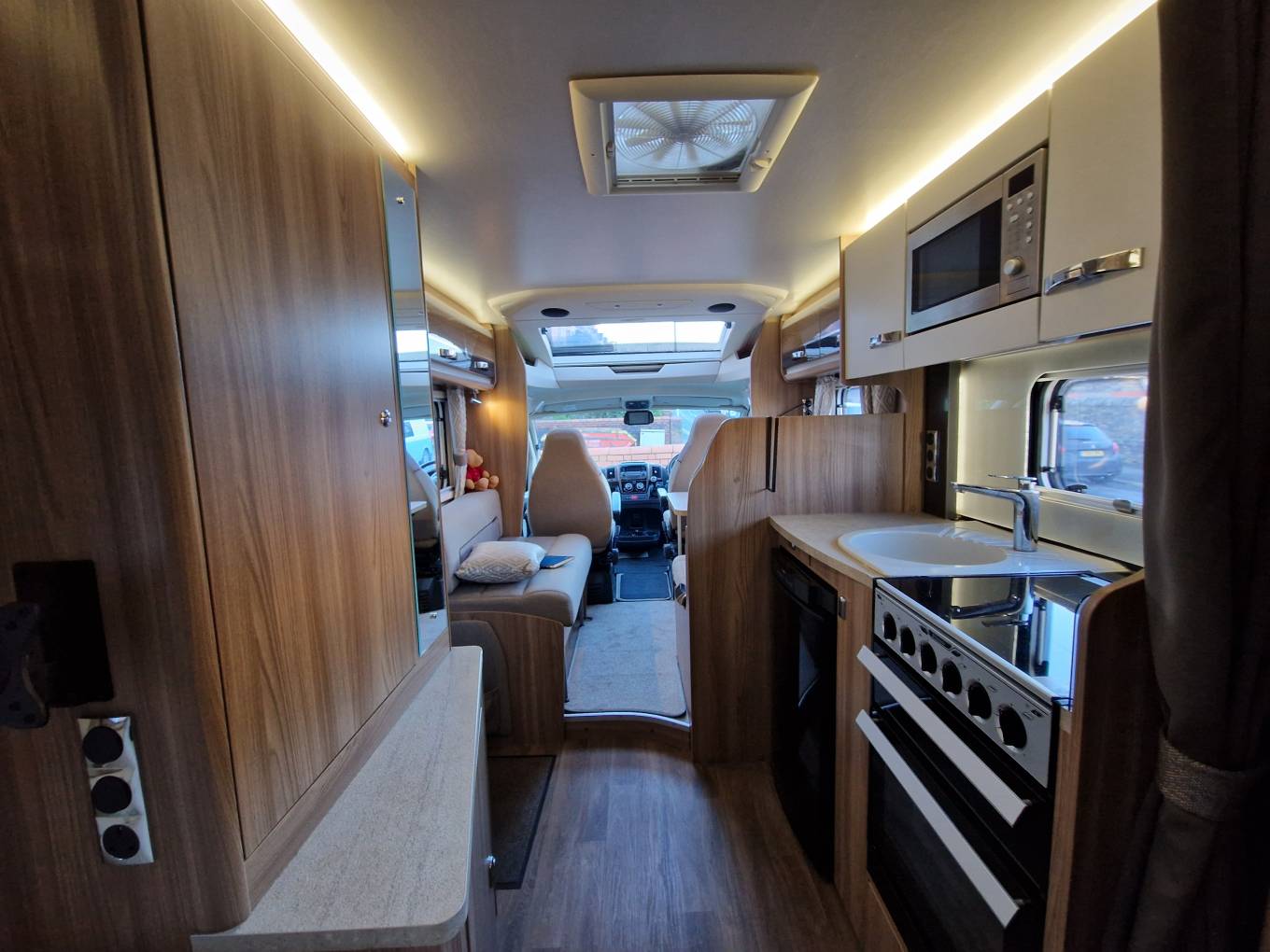 As you enter the motorhome the bedroom is on your right and features a fixed French bed which has power struts giving you access to a large storage area underneath. The bed measures 6'3" x 4'4" so will sleep most adults in comfort. You have plenty of locker space and a skylight to throw in lots of natural light. There is also strip and LED spot lighting so at night time the bedroom looks pretty spectacular.