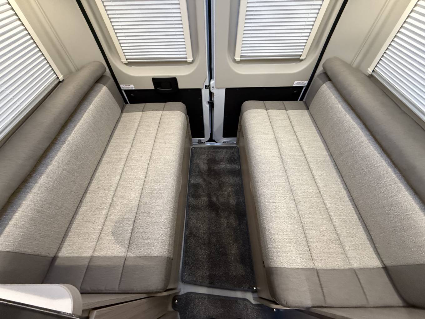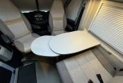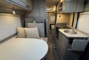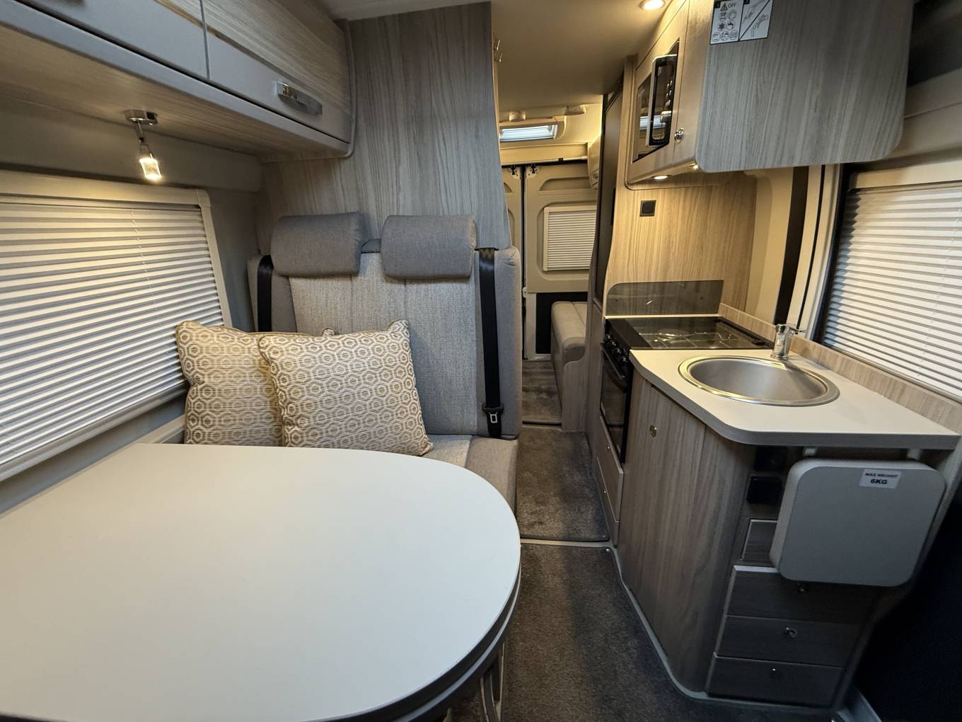 On entering up the electric step through the flyscreen protected side sliding door, in front of you is the front lounge diner consisting of twin forward facing belted seats and a pair of swivelling cab chairs with an extendable wall mounted dining table.
