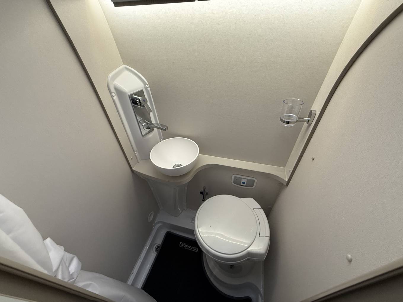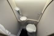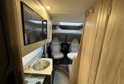 Opposite the kitchen is the wetroom style bathroom consisting of a Thetford Flushing Cassette Toilet, a Wash Handbasin and a Shower.