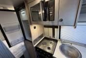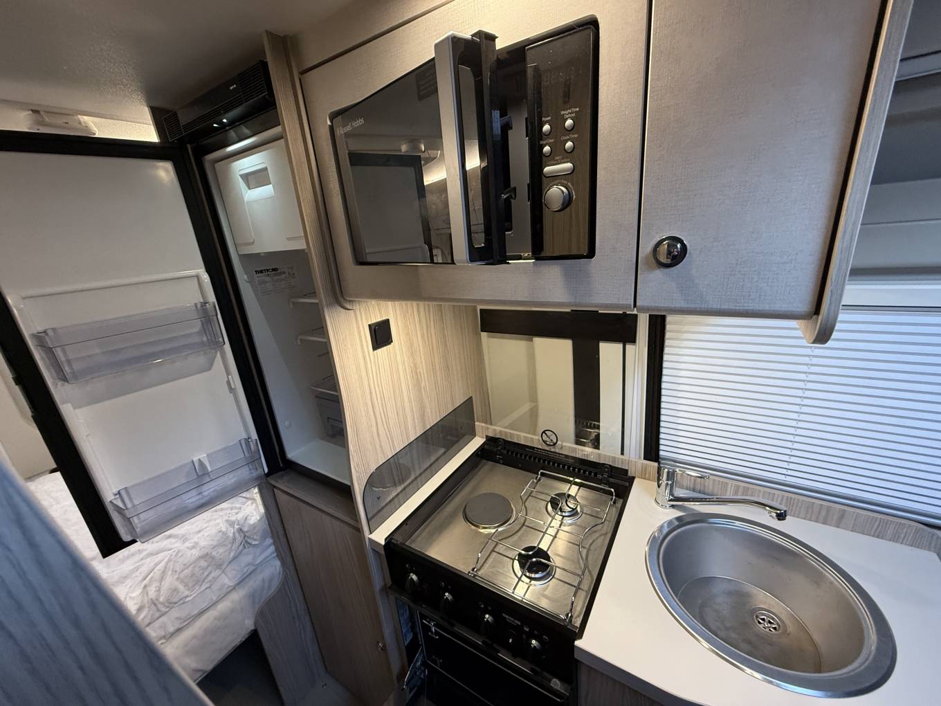 To the right as you enter is the fully equipped kitchen where you will find a Two Gas Burner and One Electric Hotplate Hob, an Oven Grill combination a 12 Volt and Mains Electric Fridge, a Microwave Oven, a Sink with a Hot and Cold Mixer Tap, an Extendable Worktop plus plenty of Cupboards and Drawers.