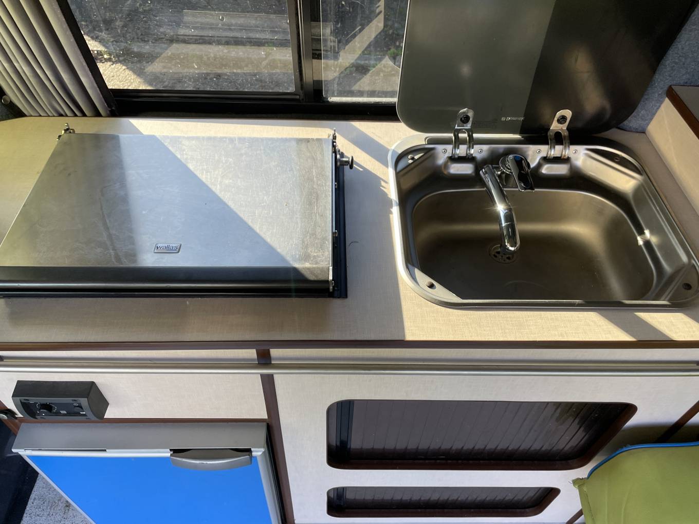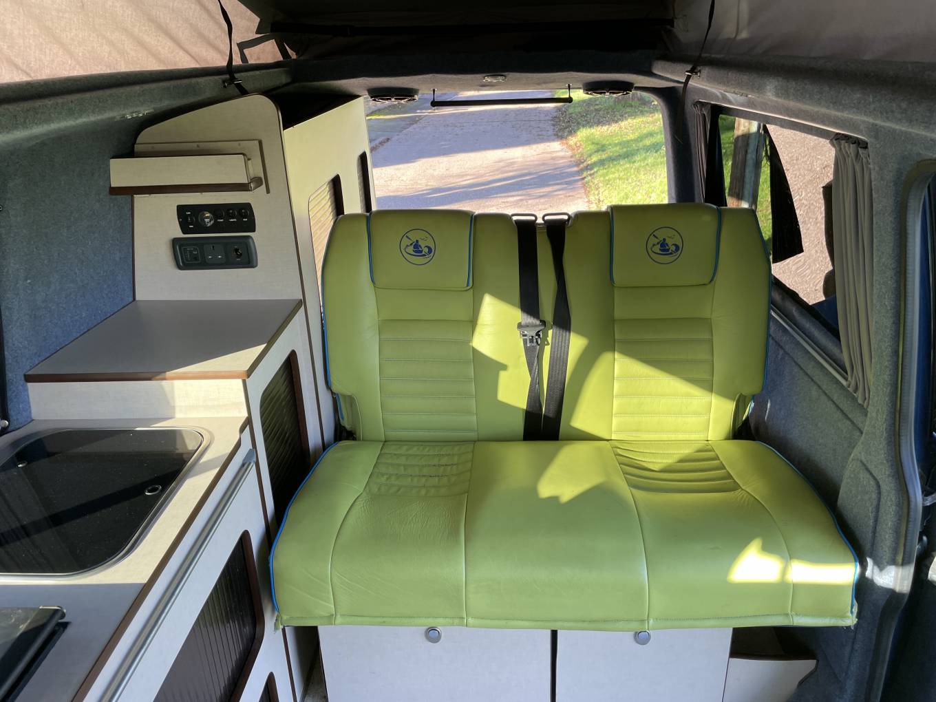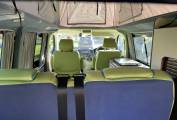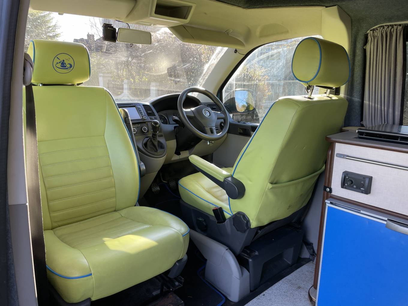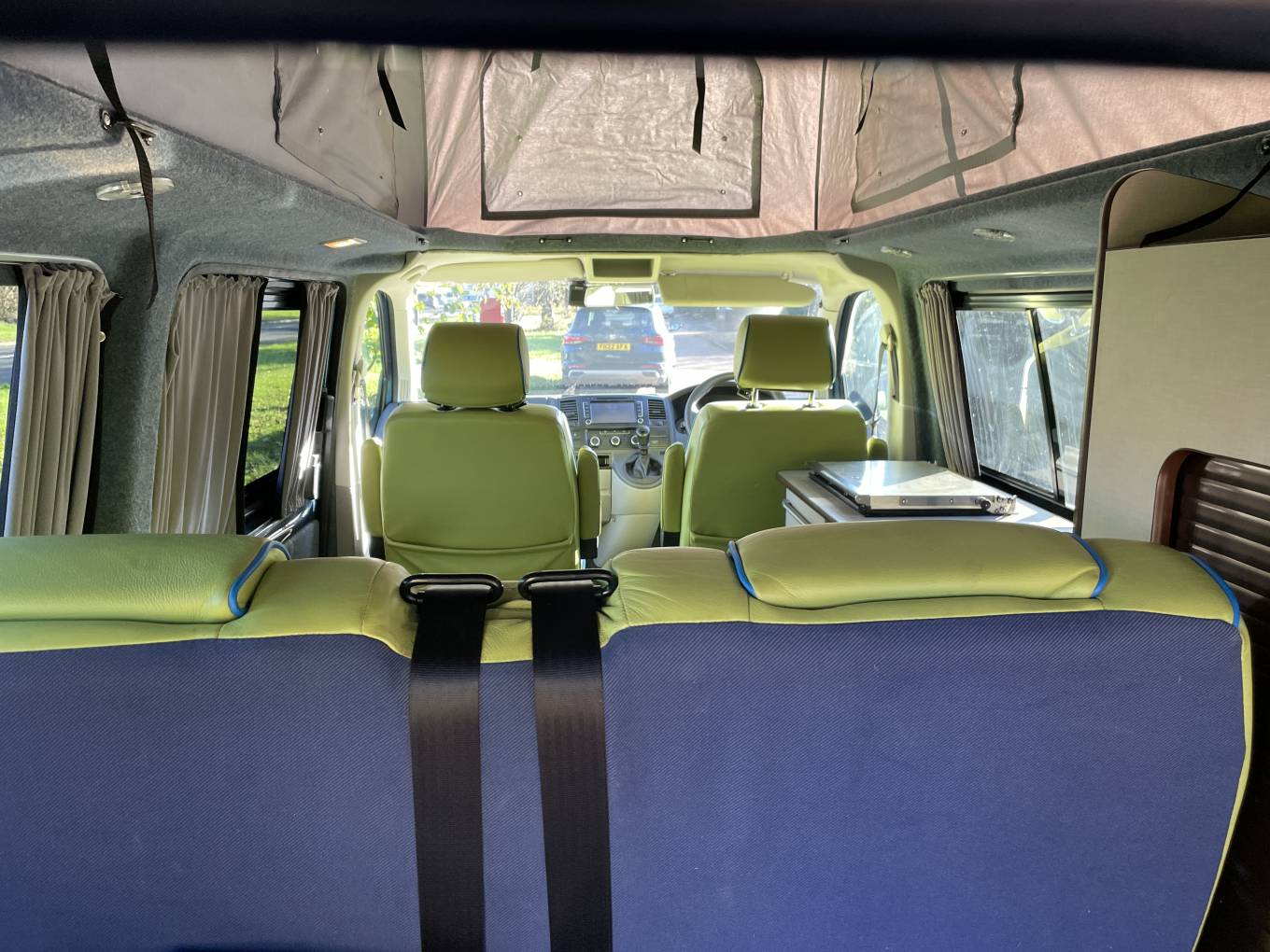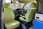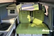 Here we have a loved and cherished VW T5.1 LWB professionally converted by ‘Coast to Coast Campers’. With a bright funky green interior that will attract attention wherever you go. There is plenty of room inside, up top there is a good full length pop-top roof which,along with the rib bed, gives 4 comfertable sleepeing berths.With a fully equipped kitchenette area (hob, sink and fridge) along with a rear shower point this makes for a very generous comfortable space for camping life. In addition to the regular kitchen facilities this camper has a Wallas hob that runs off diesel and also works as a night heater as well. This well-equipped Vw campervan runnung on 2.0 140bhp engine,6 speed manual, with cab aircon, reversing camera and comes with a great service history .