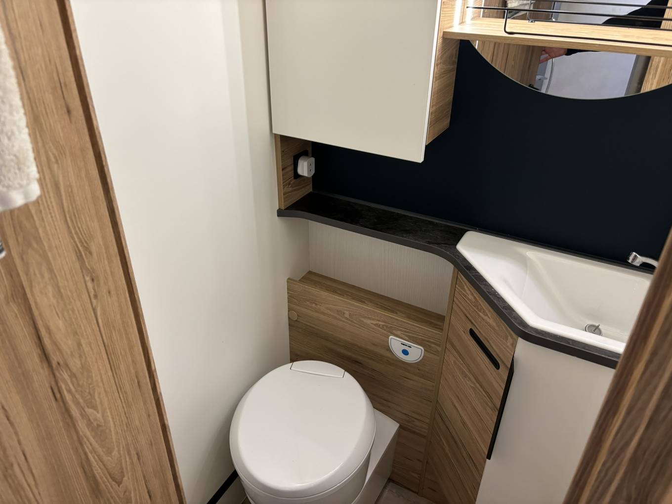Additionally, the motorhome includes a full bathroom with a separate shower,