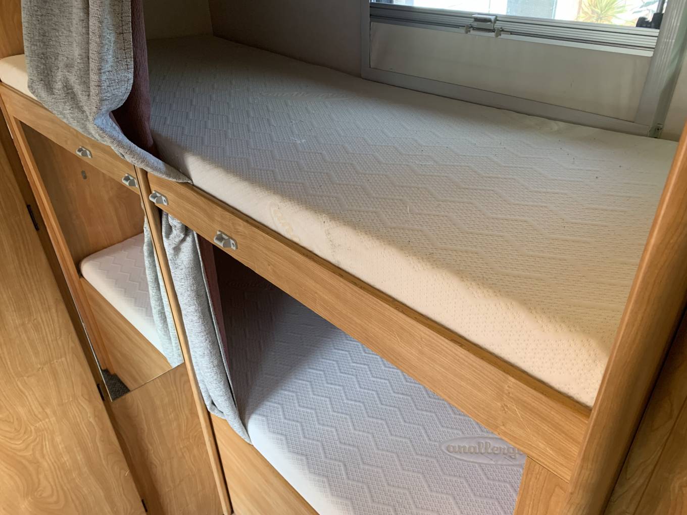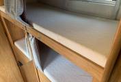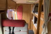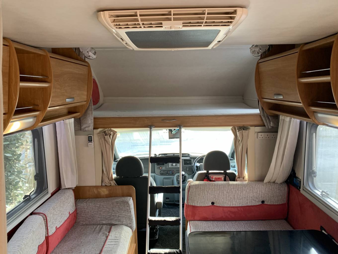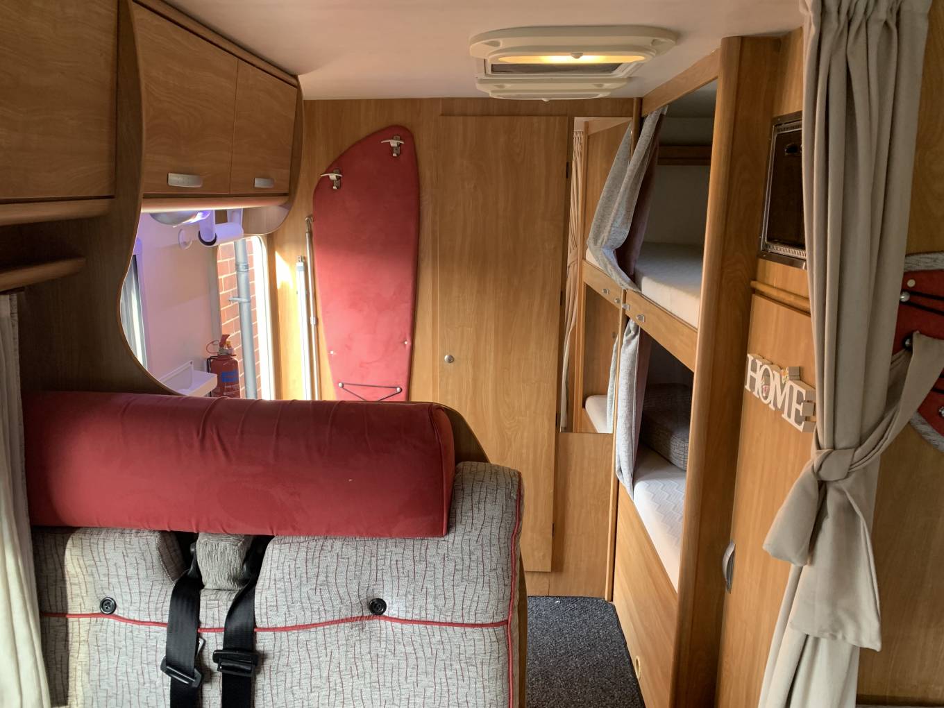 Call with any questions on 01423 609985. This Rimor Katamarano Sound is a great family motorhome, with 6 or 7 berths. Briefly, there are 2 bunk beds at the rear, next to washroom. Kitchen, long sofa, twin dinette that has forward facing travelling seats with seatbelts and lap belts for rear facing passengers, then overcab bed. Its 6.82 metres long, registered in 2008, the current owners bought it in 2013. 100,000 miles on the clock. The upholstery, fixtures and fittings are in good condition.