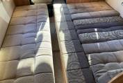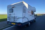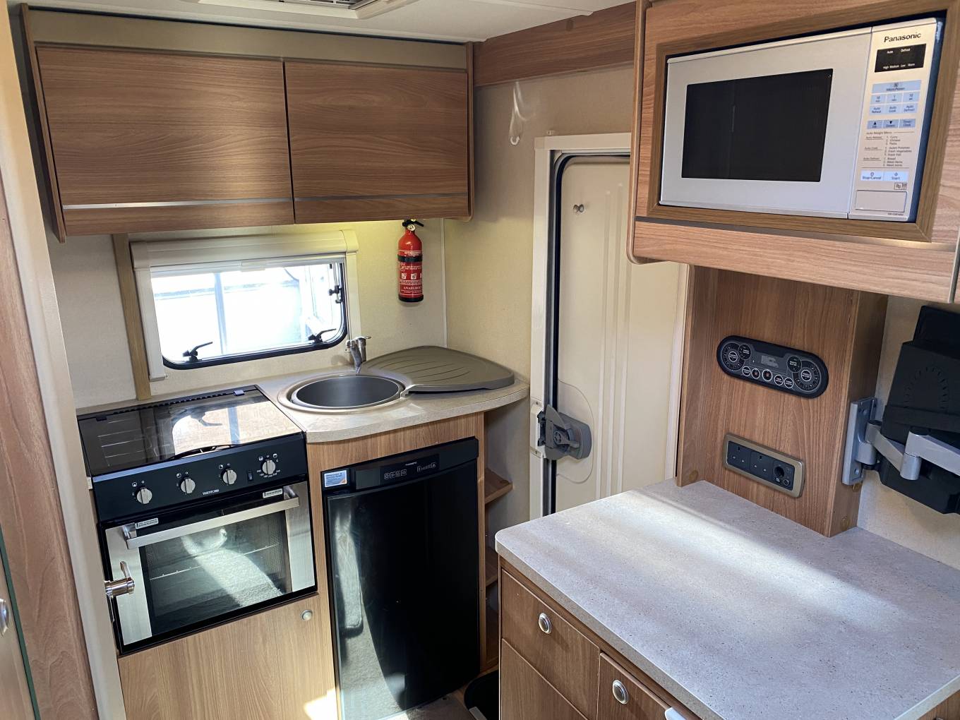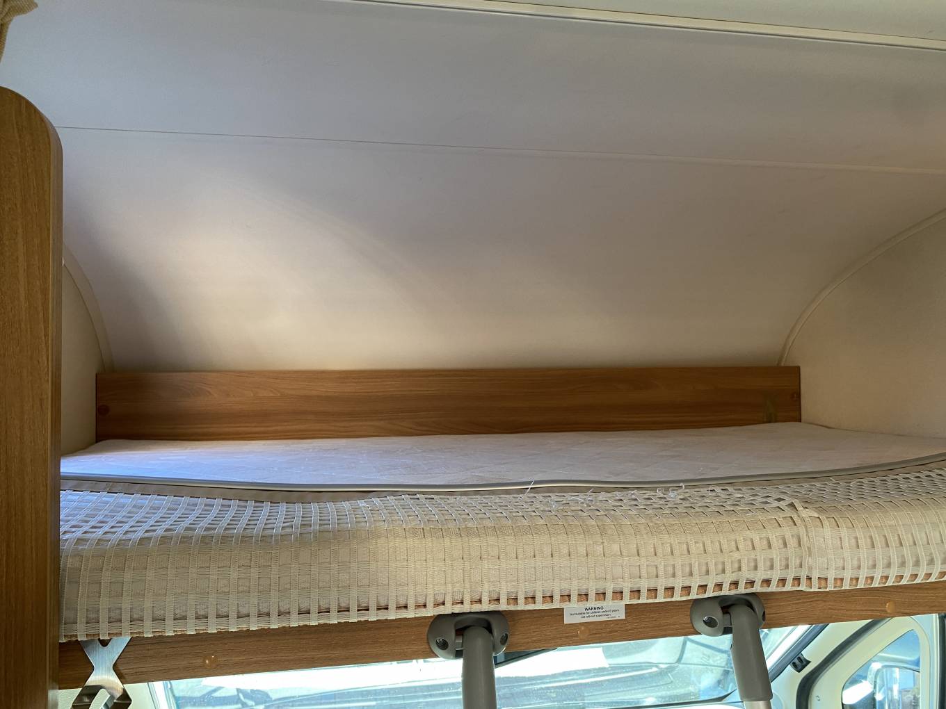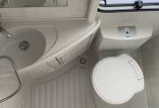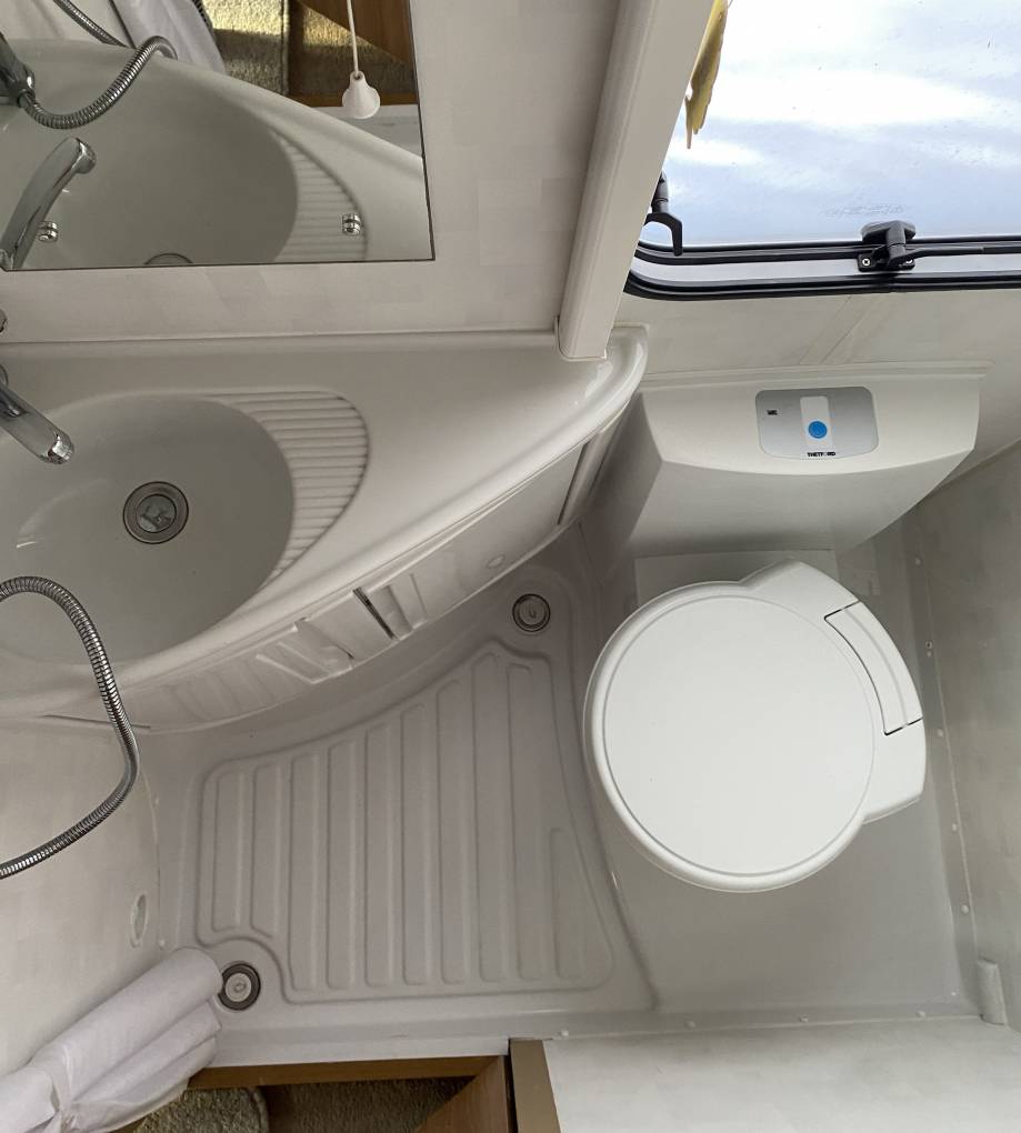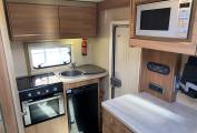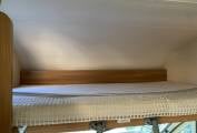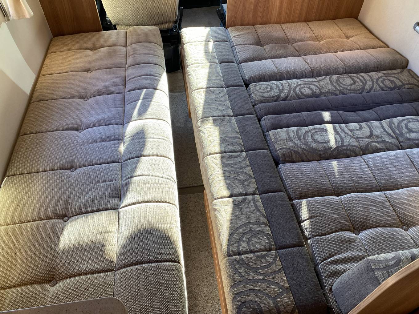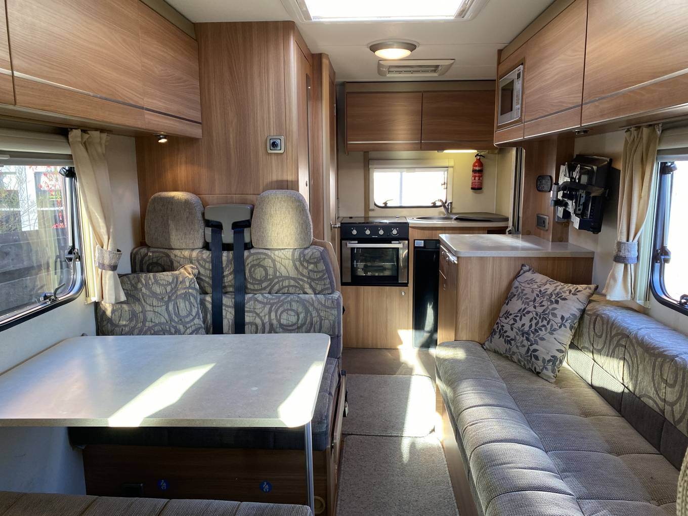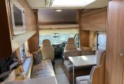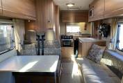 Entering the habitation area there is a well equipped end kitchen which includes an oven, 3 ring gas burner, grill, 3 way fridge, wash basin and microwave. The washroom is complete with shower, toilet and wash basin. As we walk forward through this light and airy motorhome we are greeted by the spacious dinette. The dinette is the perfect place to relax and seats 5/6 people comfortably. When the night draws in the dinette area converts to a comfortable double bed and the single bench seat along the nearside wall can be used as a single bed. Finally, we climb the ladder to a comfortable over cab double bed.