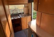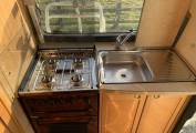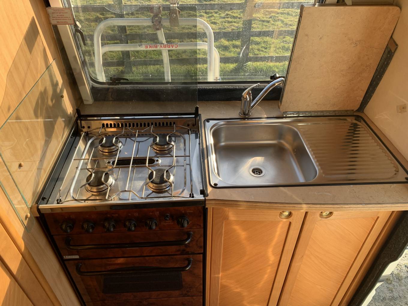 burners, plus sink and next to the habitation door, is a worktop and below a