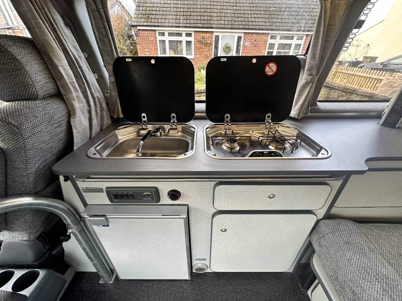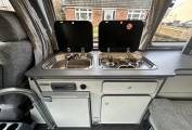 This campervan comes fully equipped with a sizeable rock 'n' roll double bed, a kitchenette equipped with two gas hobs, a sink, fridge with ice compartment and plenty of storage, including cutlery drawers. To warm the campervan, a Webasto diesel heater is fitted. For socialising, a removable table is easy to set up and the passenger seat swivels to allow three people to comfortably sit within the campervan. With the pop top and the rock and roll bed it will sleep 4 in the van with everything you need after a day out. Externally this van certainly doesn’t look its age as it has had a ceramic coating on the paintwork and has the bull bars and chrome steps; with the bike rack on the back and roof bars on the top this is van is fully equipped for getting away on adventures.
