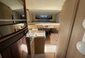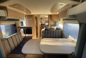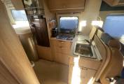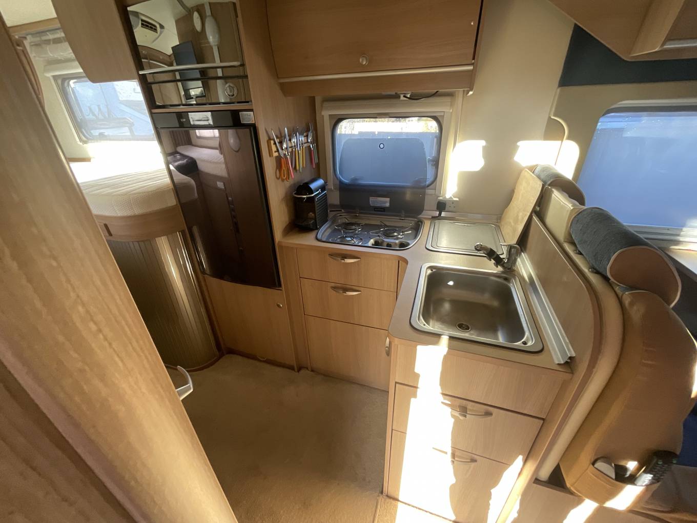 The layout of the IT726 is really ideal for a couple looking to spend long trips away. It has a good sized lounge area at the front featuring a forward facing double sofa, side sofa and the two front seats that can be rotated around to create a wonderful area to sit and relax either with friends or on your own. There is a large table in the centre that can be extended further to seat up to six people. The motorhome also has an tv that pops up from the arm rest of the side sofa and can be stored away when not in use. Moving back the motorhome has a well equipped kitchen for a continental motorhome. It comes with an oven, grill, hob with 3 gas burners, sink, drainer and large fridge and separate freezer.
