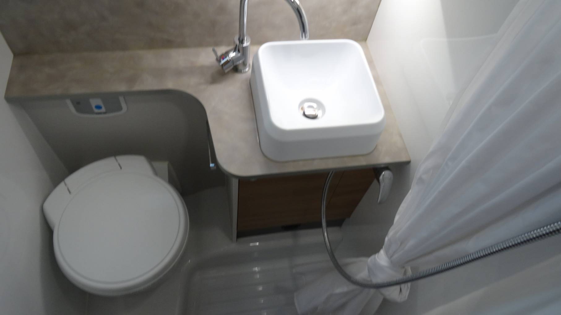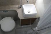 Next comes a smart bathroom with toilet, washbasin and