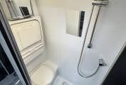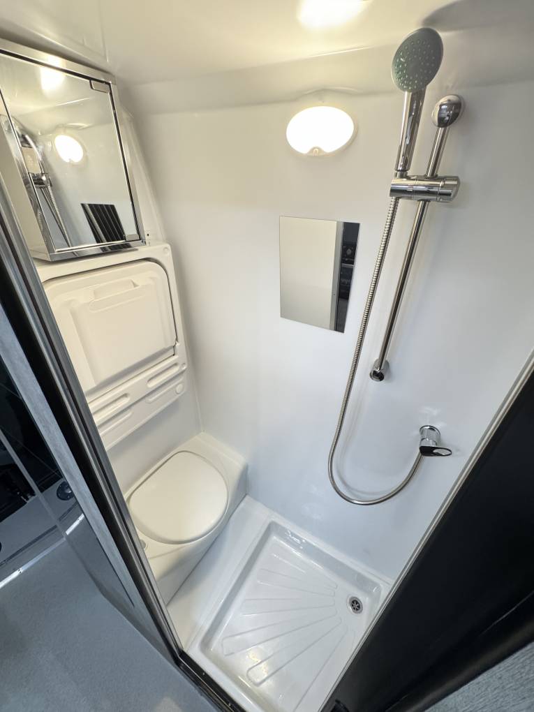 van is a good size immaculate washroom with toilet, sink with mixer tap and
