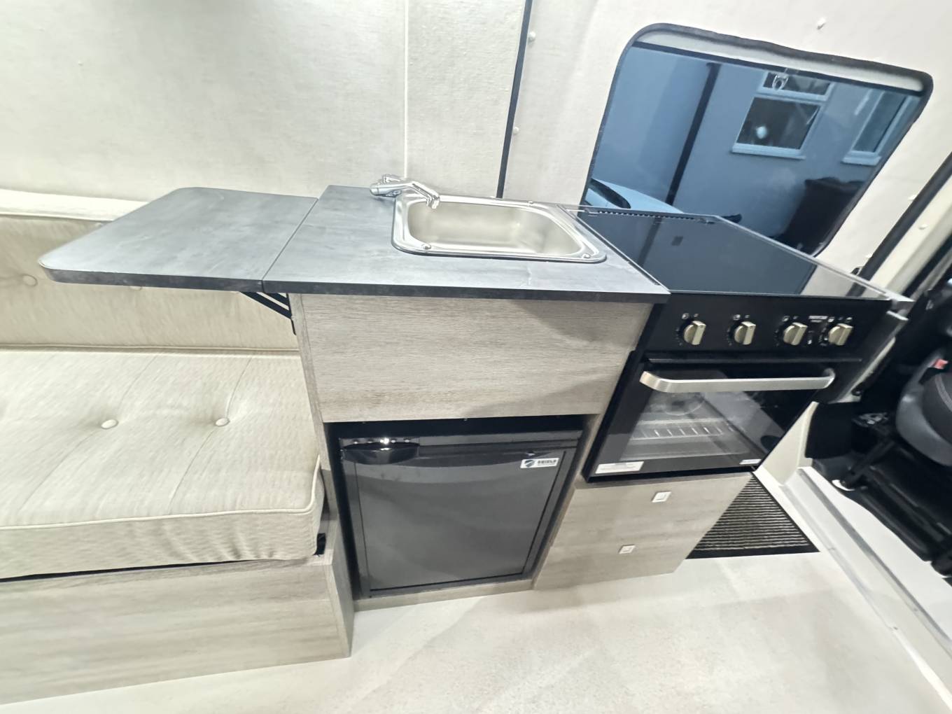 sink with mixer tap and plenty of storage, 65ltr compressor Fridge. Also, mid