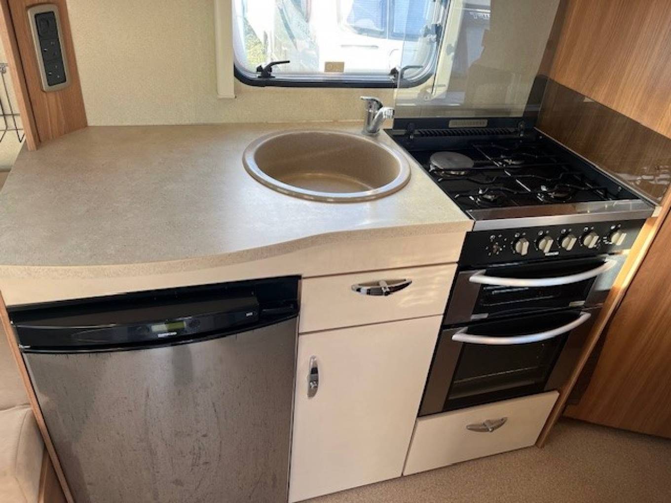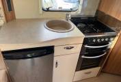 The Kitchen Area has a Full Oven, Hob, Grill, Sink, Three Way Fridge Freezer, Microwave, Storage and Work Space