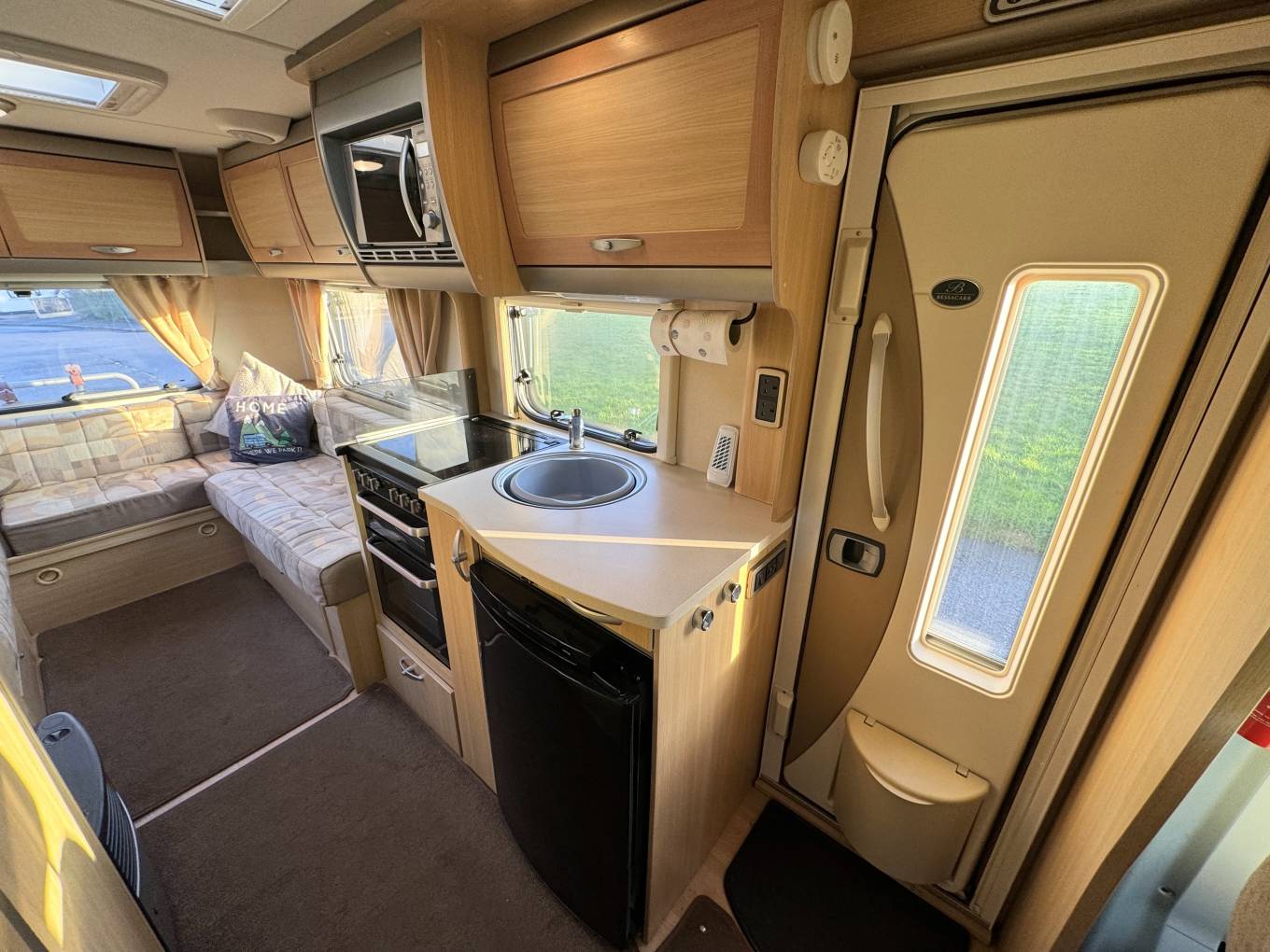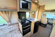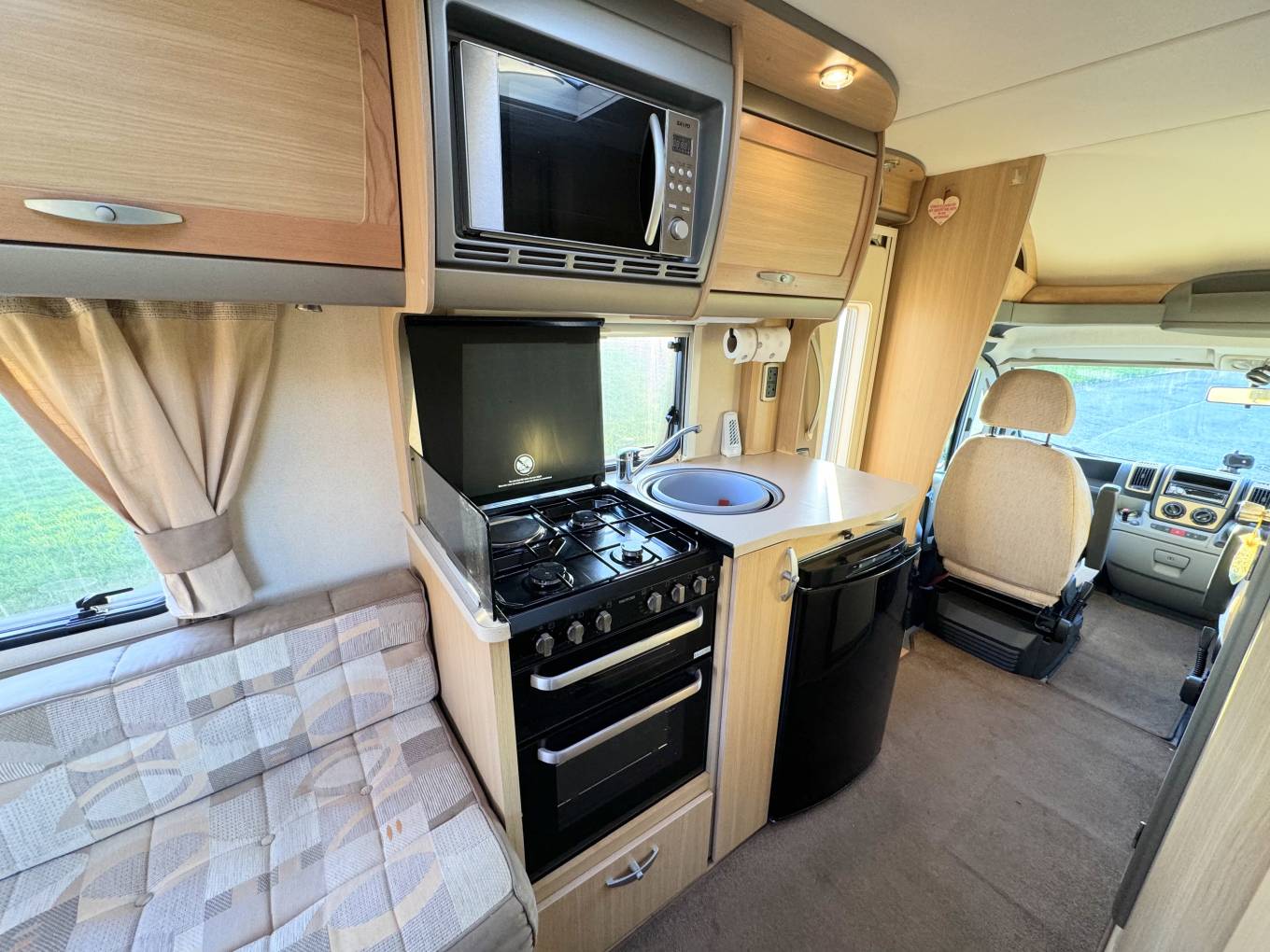 The kitchen is fully equipped with a three-burner gas hob, electric hot plate, oven, grill, new Thetford fridge, circular sink, microwave, and plenty of storage.