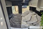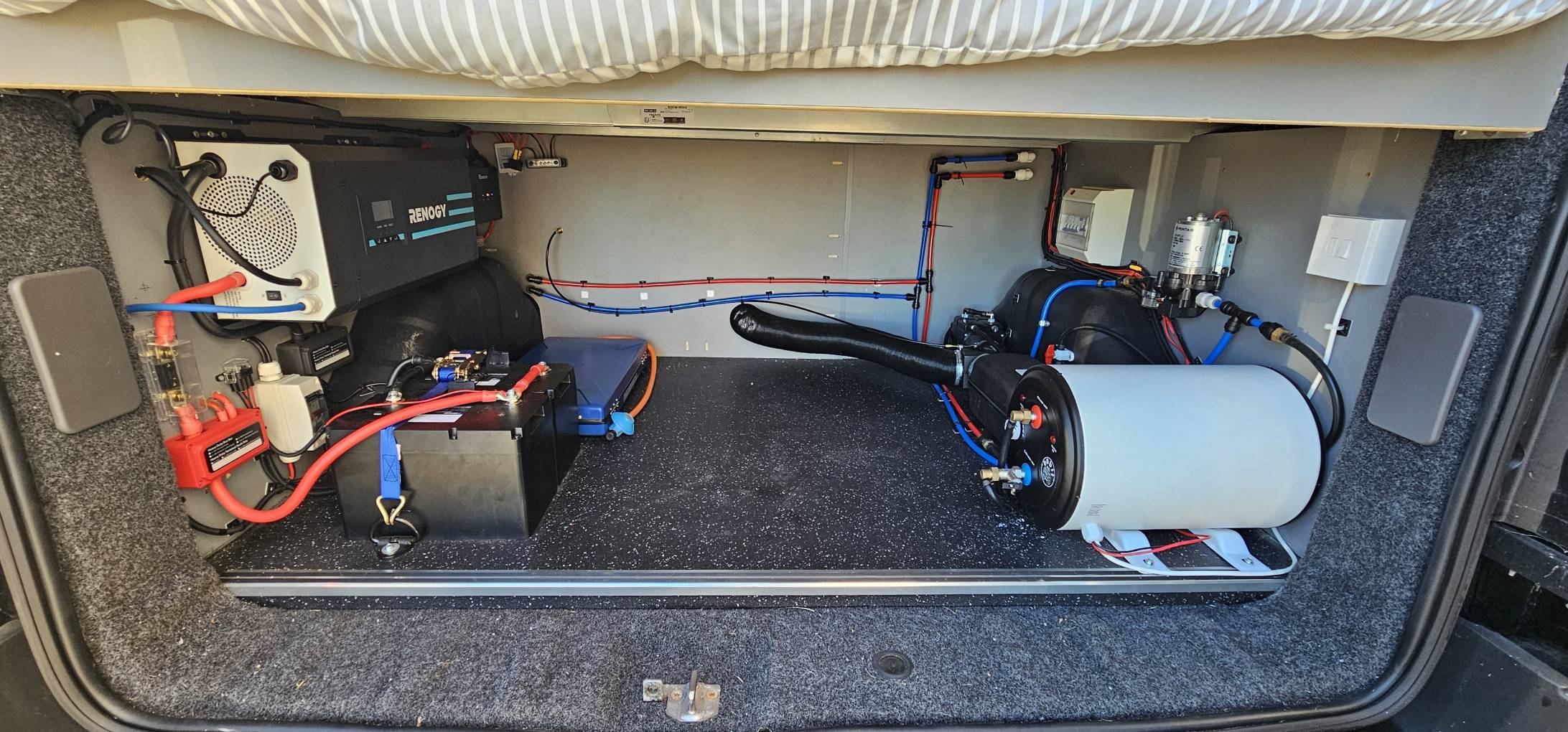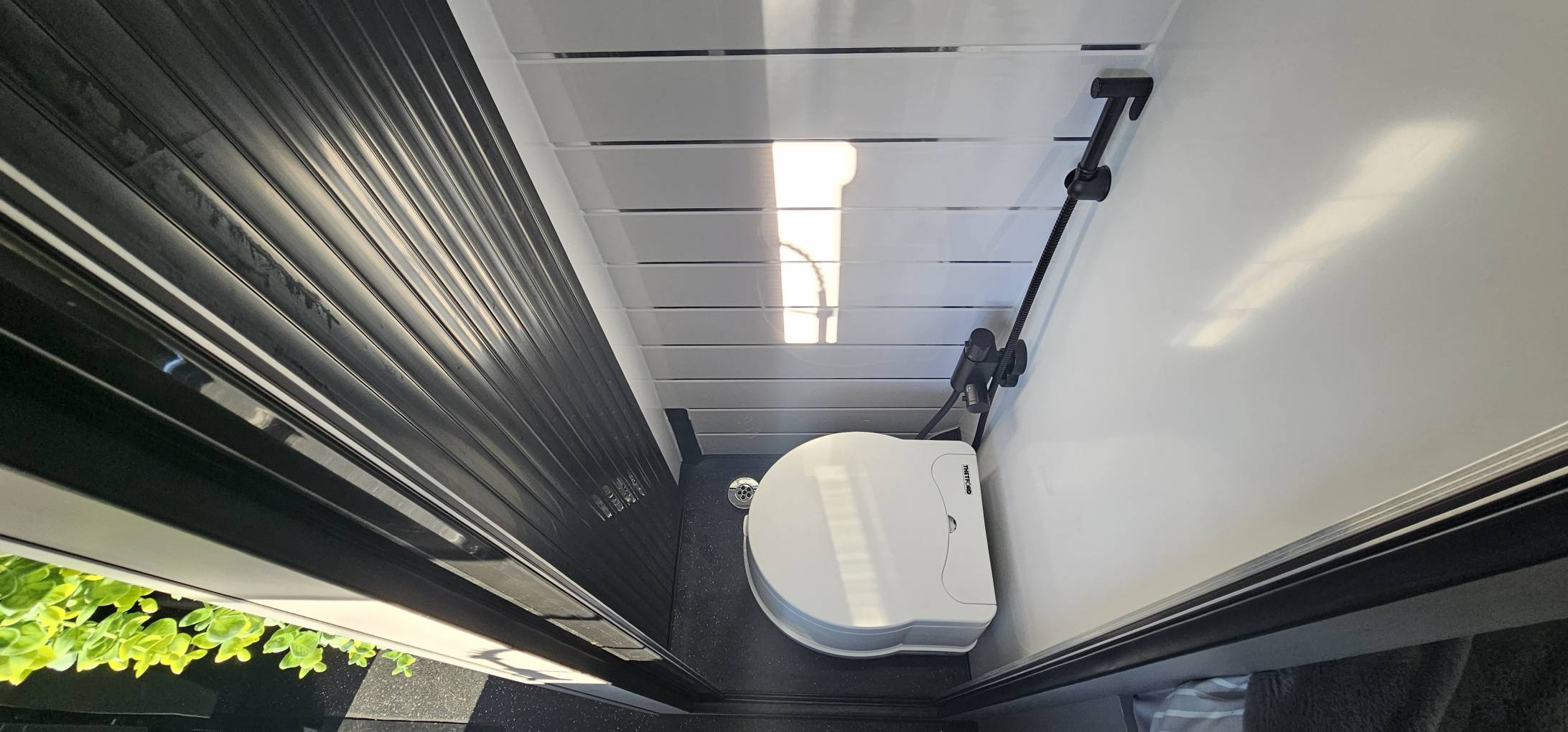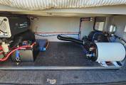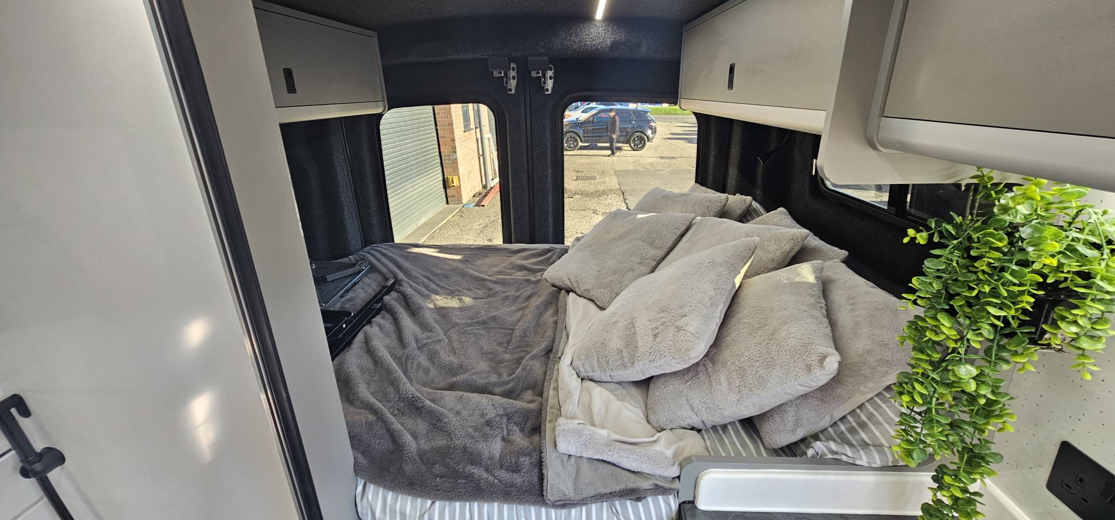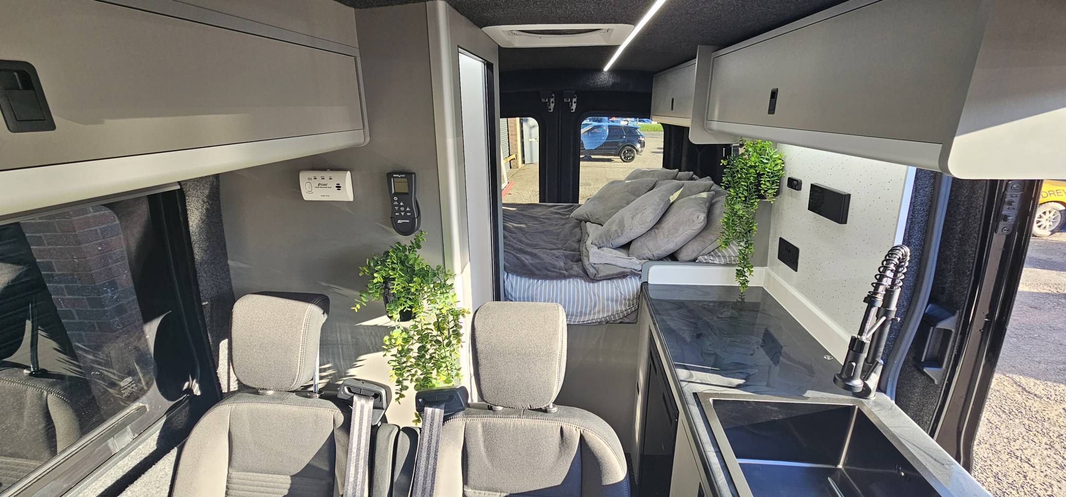 The van is fully insulated with Kingspan, has Altro flooring, a lined shower room, a 10L hot water cylinder heated by diesel, solar, or electric, and an Autoterm 4KW diesel heater. Other highlights are underslung fresh/waste tanks, a Max Air Fan, dashcams (front/rear), WiFi antenna, a 12V fridge, portable induction hob, DAB radio, Apple CarPlay, Android Auto, Bluetooth, a factory alarm, cruise control, and cab air conditioning.