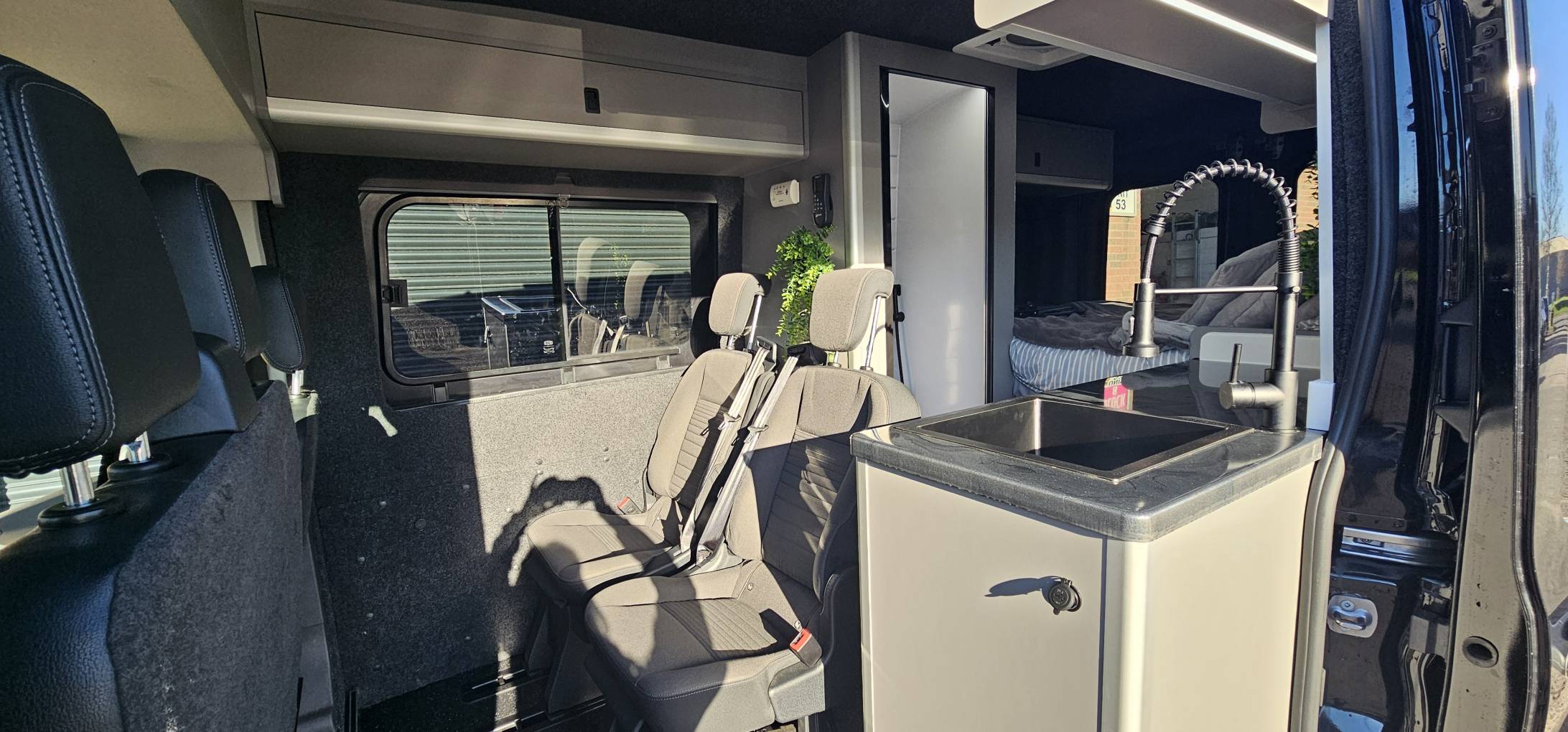 Key features include a Renogy solar system with 350W panels, a Renogy One control panel, 2 x 100Ah lithium batteries, a 2000W inverter charger, and a 50A DC/DC charger with MPPT. It seats 5, sleeps 2, and offers an optional Cabbunk kids’ bunk.