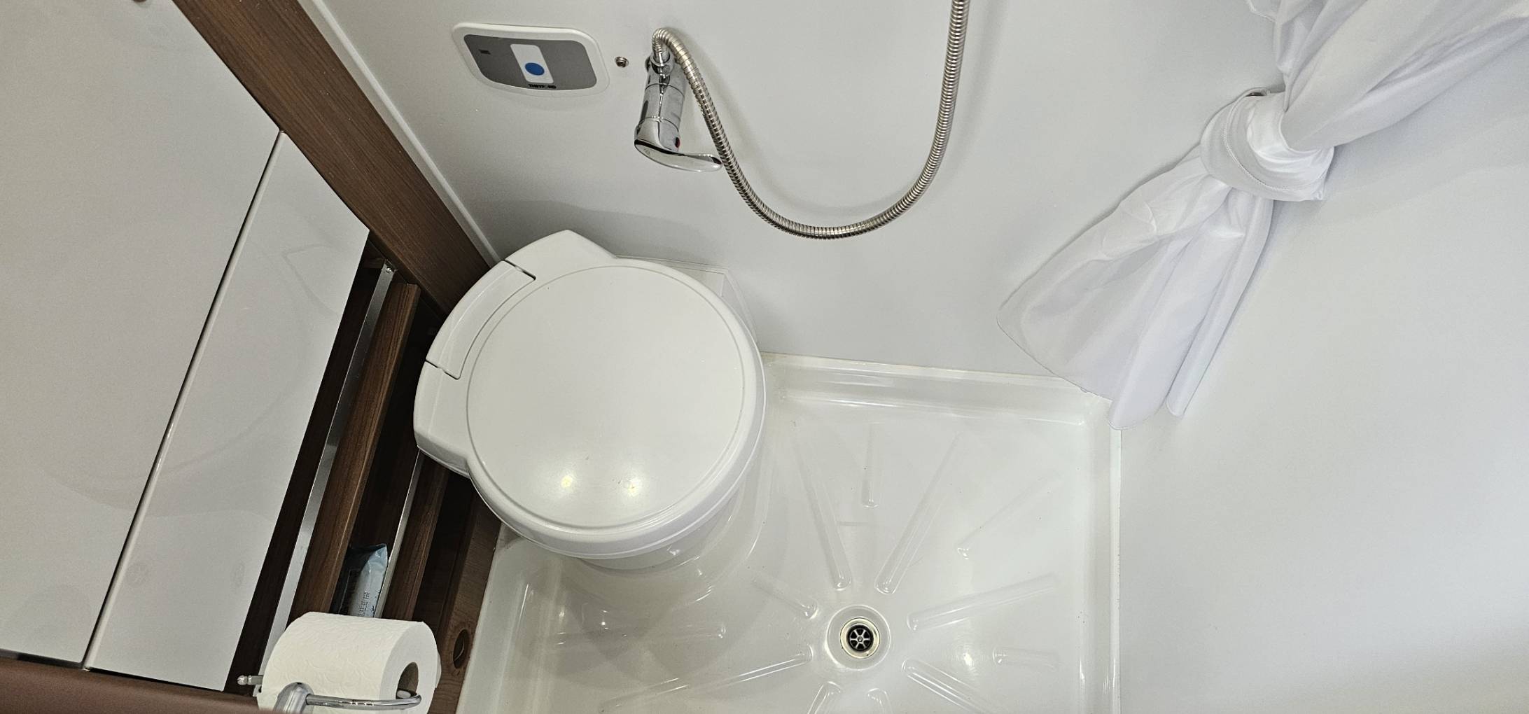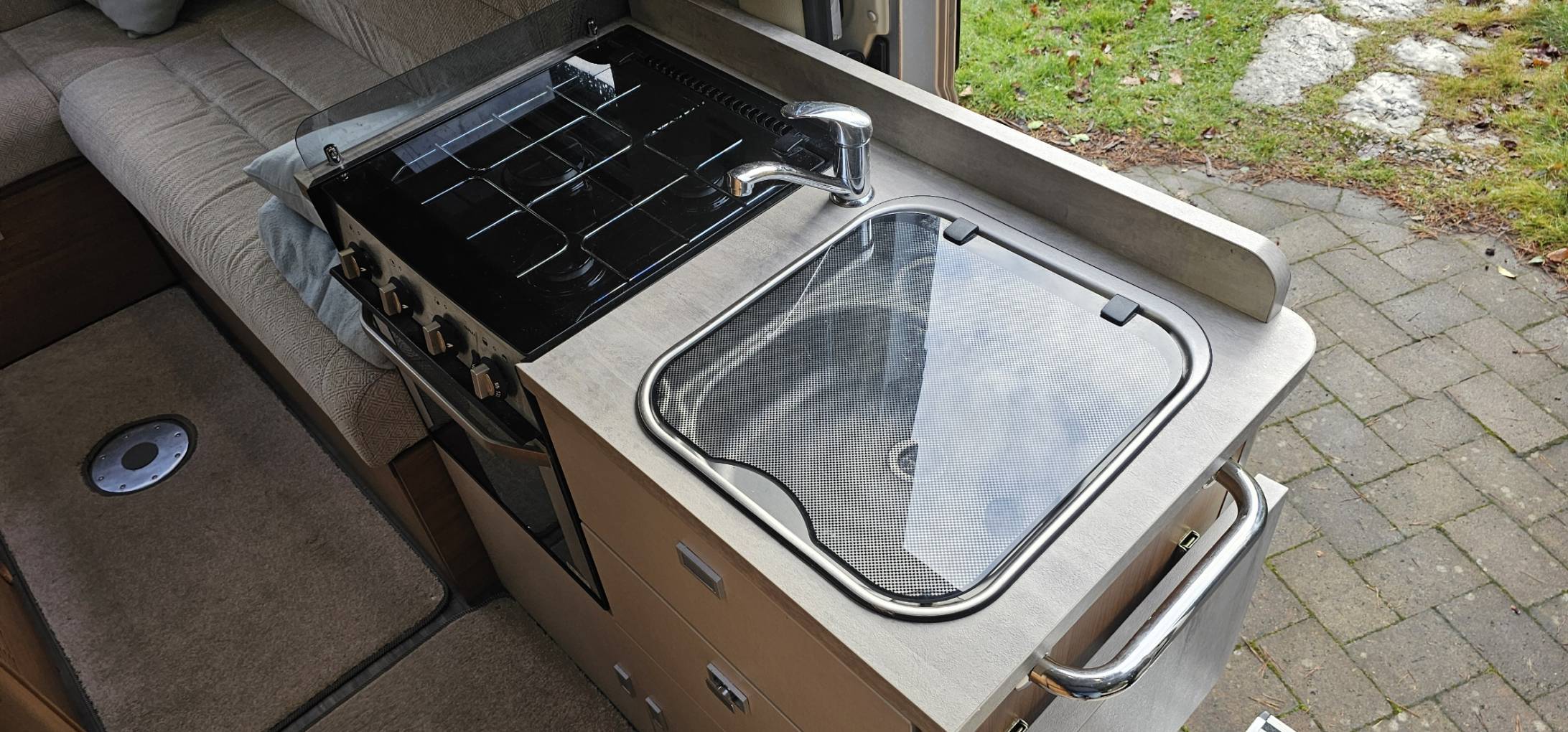 The layout from the rear has the sought-after U-shaped end lounge, which easily converts at night into a large double bed or can be used as two single beds this area has full round panoramic windows and has a fitted TV/DVD player with aerial. Further forward you have a fully functional wet room with cassette toilet and shower, adjacent you have the kitchen area which has a 3 gas burner hob, sink, oven,grill and microwave which is a rare find in this class of motorhome, there’s also a three-way fridge freezer under the wardrobe and further forward to the cab area the swivel seat with flap/extension and power socket when needed.