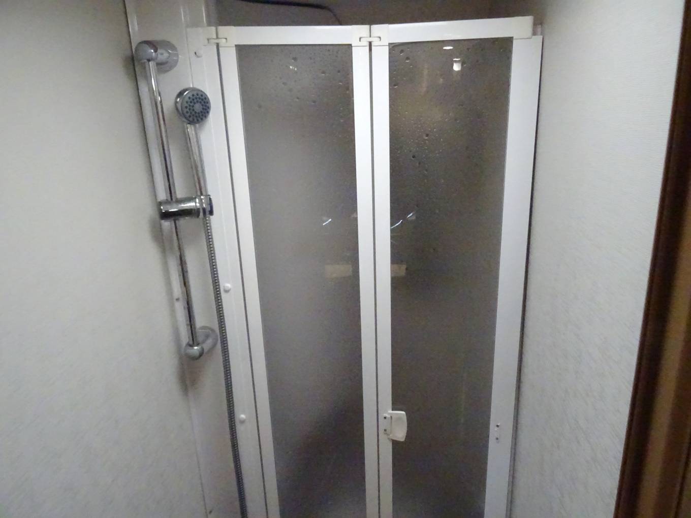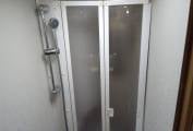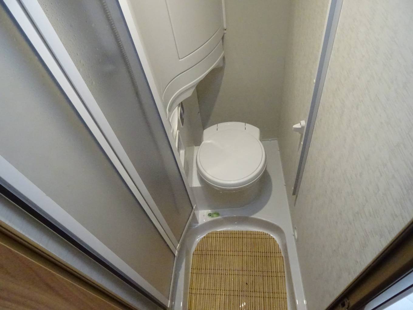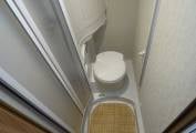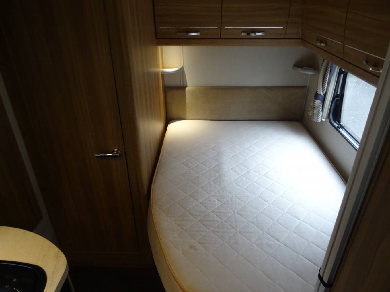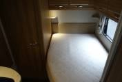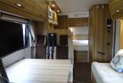 At the rear nearside is the hinged french bed with good understorage. The space saving washroom is adjacent, it has integrated toilet and shower with a pull out basin and storage. There are overhead storage lockers in the bedroom and a concertina door to separate from the front area.
