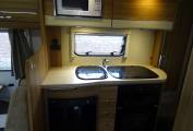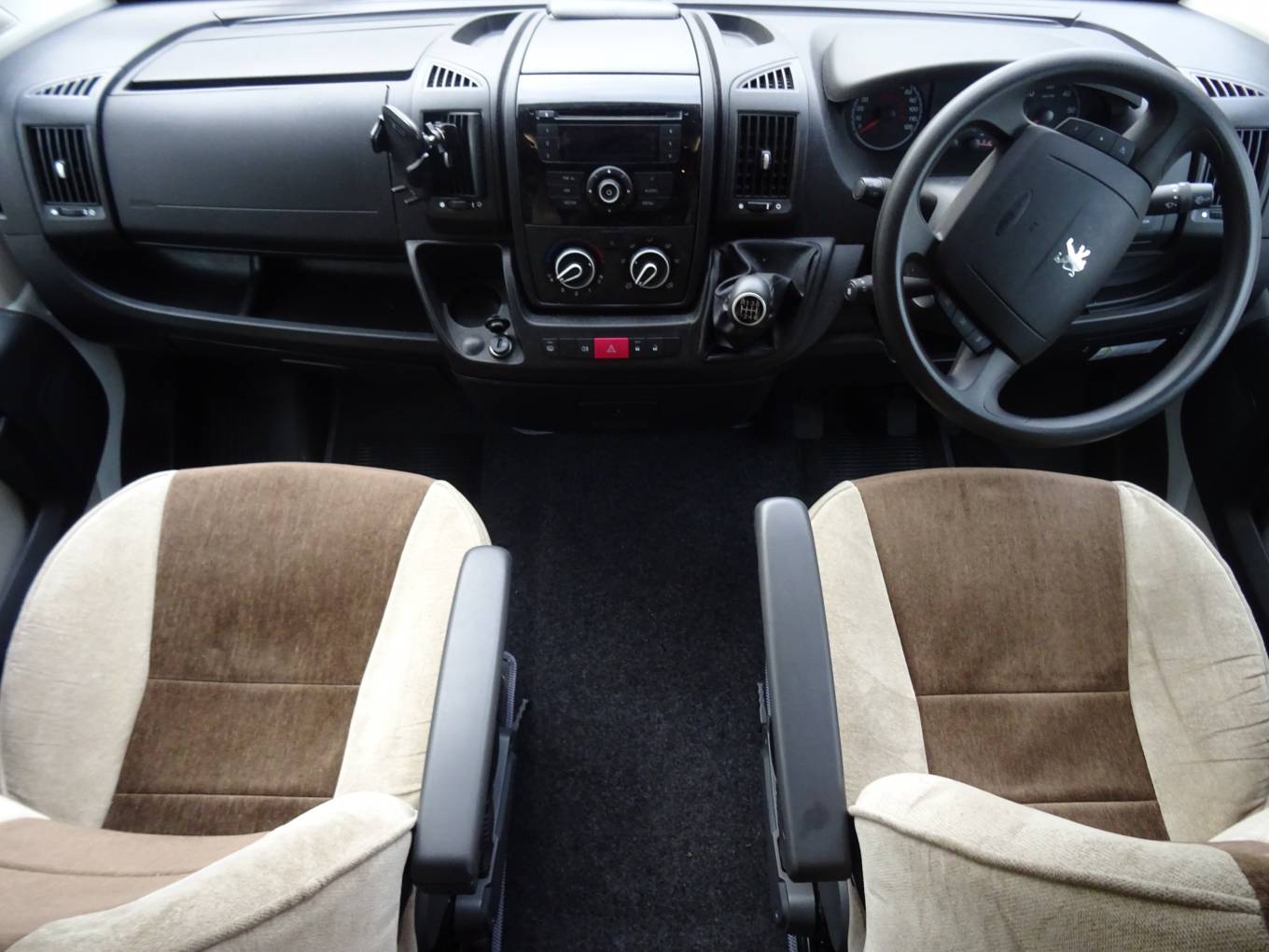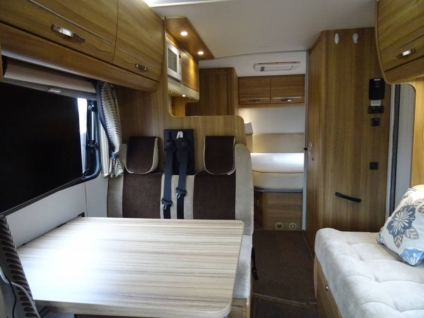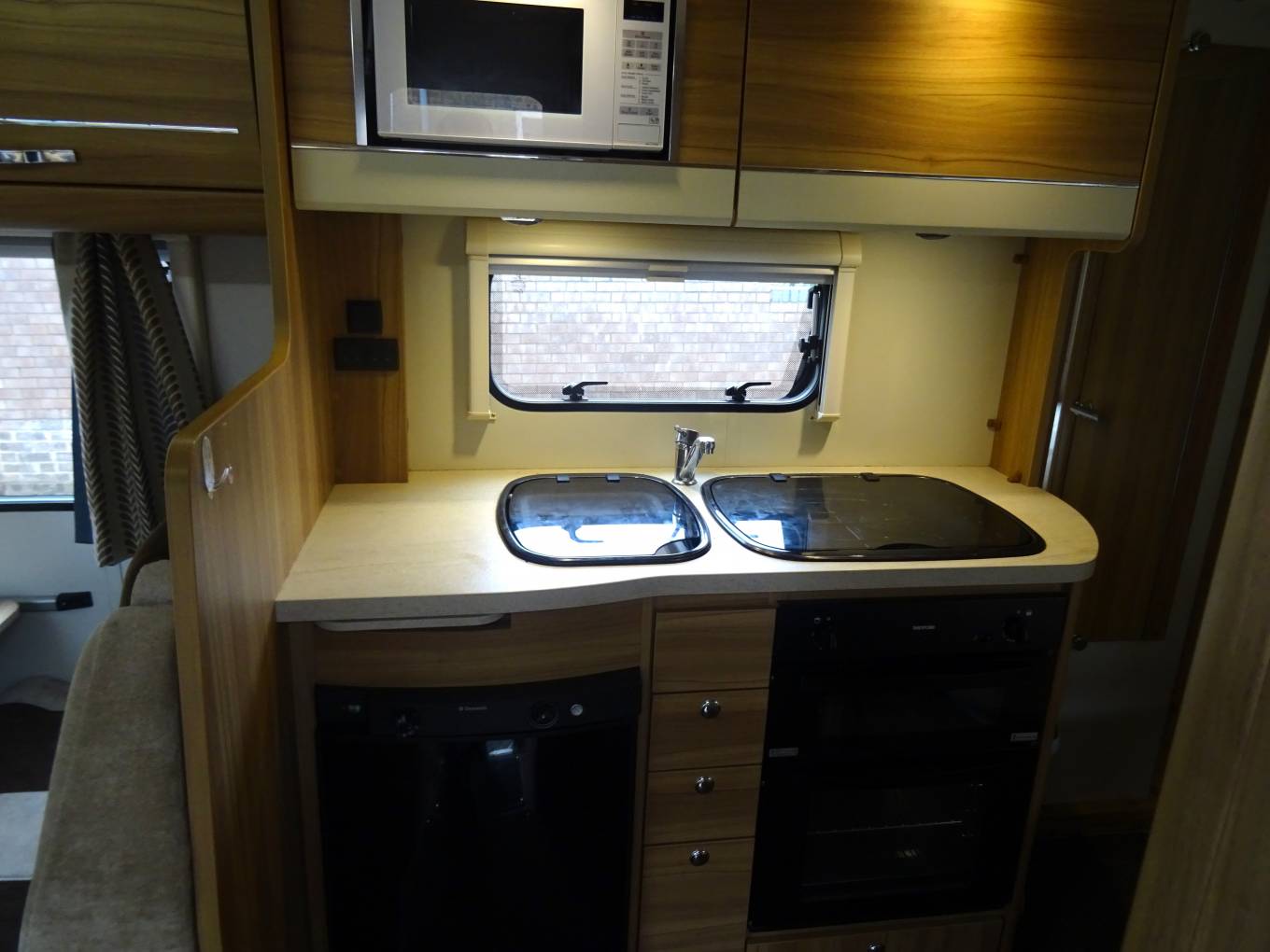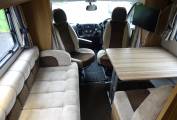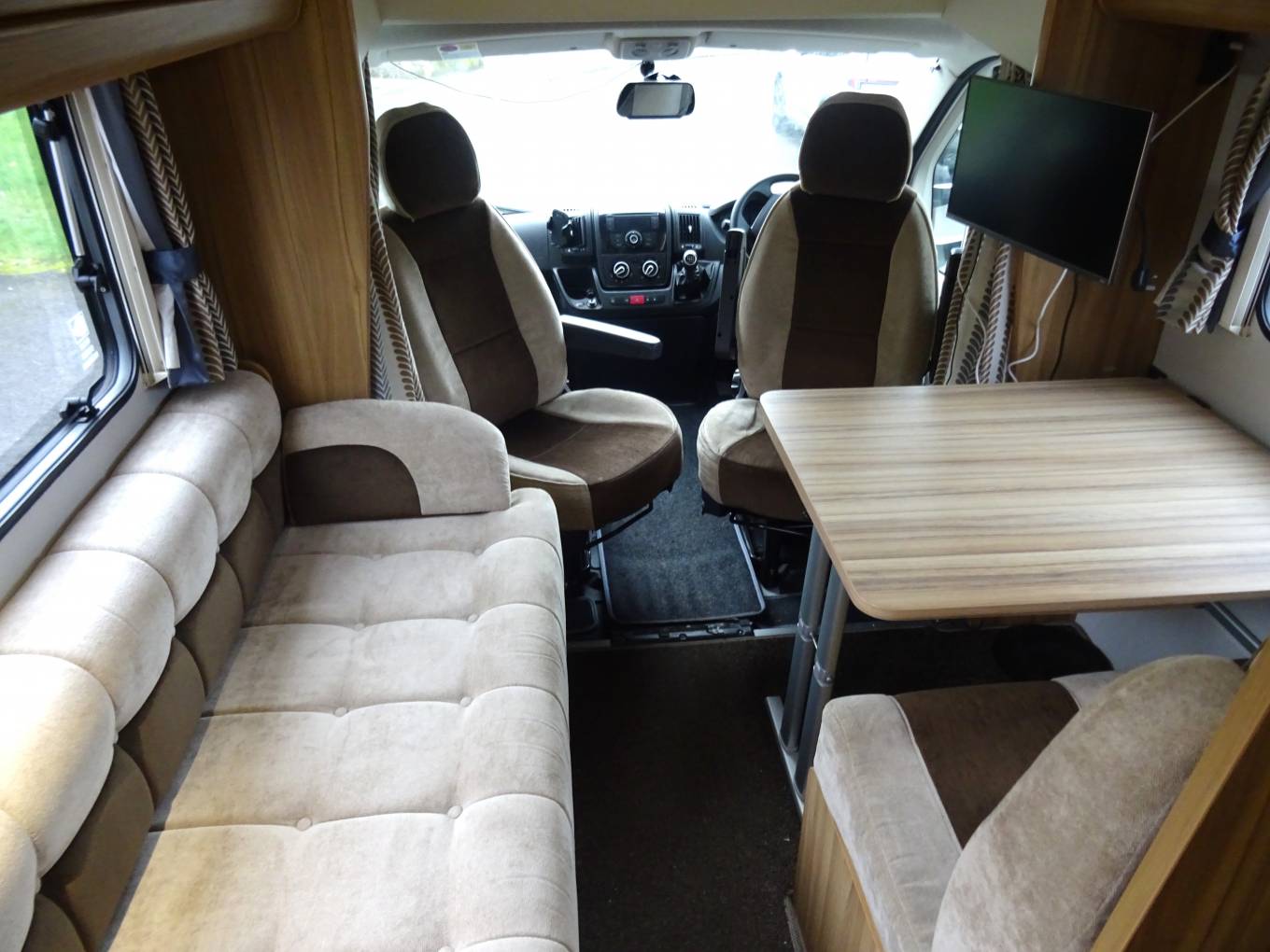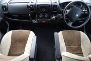 The kitchen area has a full size oven/grill, 3 gas hob, sink and mixer tap, microwave, 3 way fridge and work top extension. Opposite is a van high double hanging wardrobe. Both cab seats swivel. The lounge/diner has a twin forward facing (belted) sofa and there is also side twin seating. There is a large, robust, adjustable table. All this can be rejigged to make a large double bed.