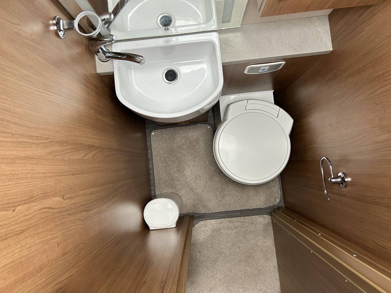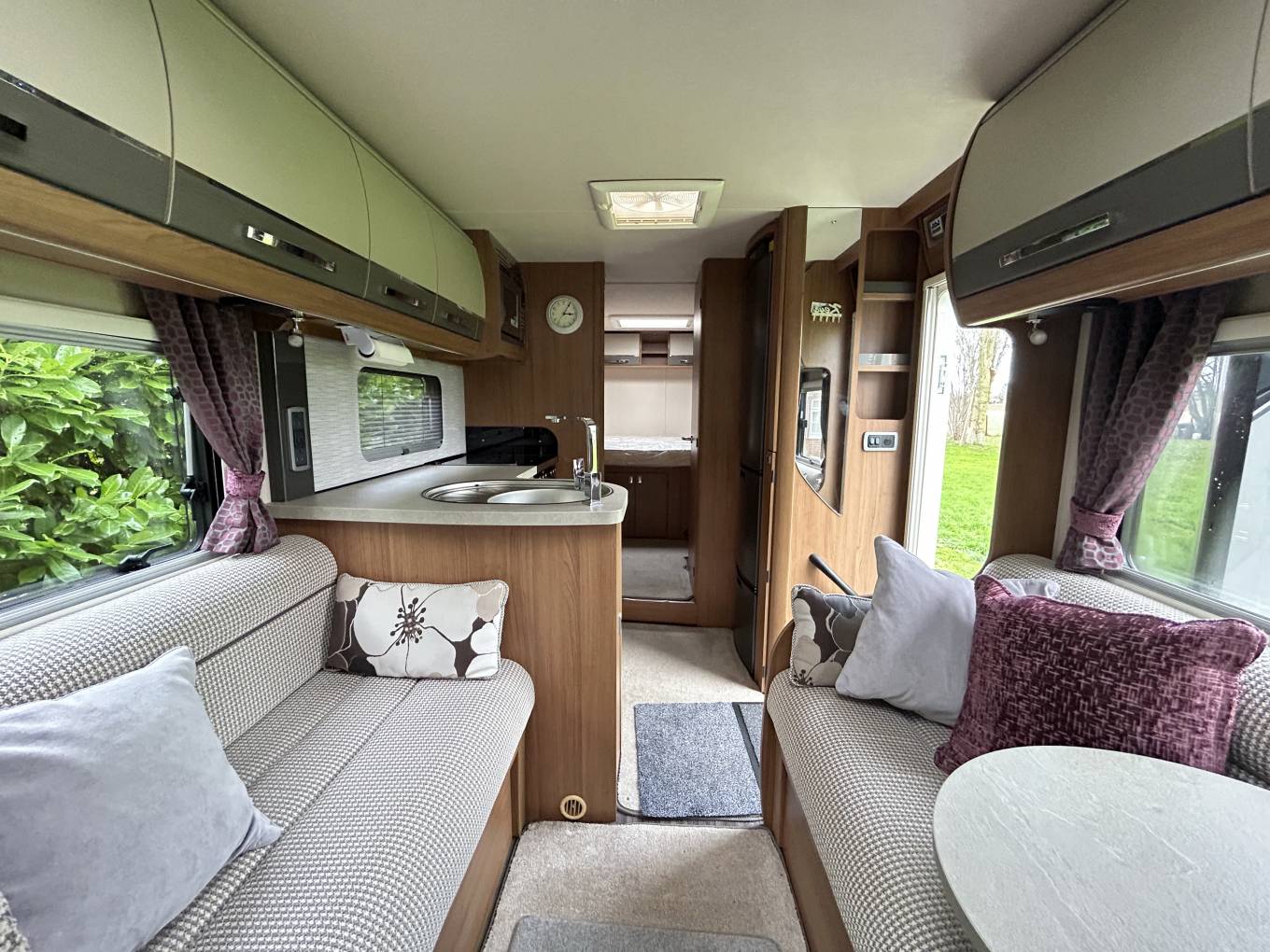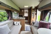 The well-appointed mid-kitchen is fully equipped with a large fridge freezer (including chiller drawer), oven, grill, microwave, and a dual-fuel hob (3 gas burners plus electric hotplate). Ample storage space ensures all your kitchen essentials are neatly stored. Further back, the split washroom layout includes a separate shower cubicle with Perspex screen and a separate toilet area with Thetford cassette toilet, basin, mirror, and cabinet.
