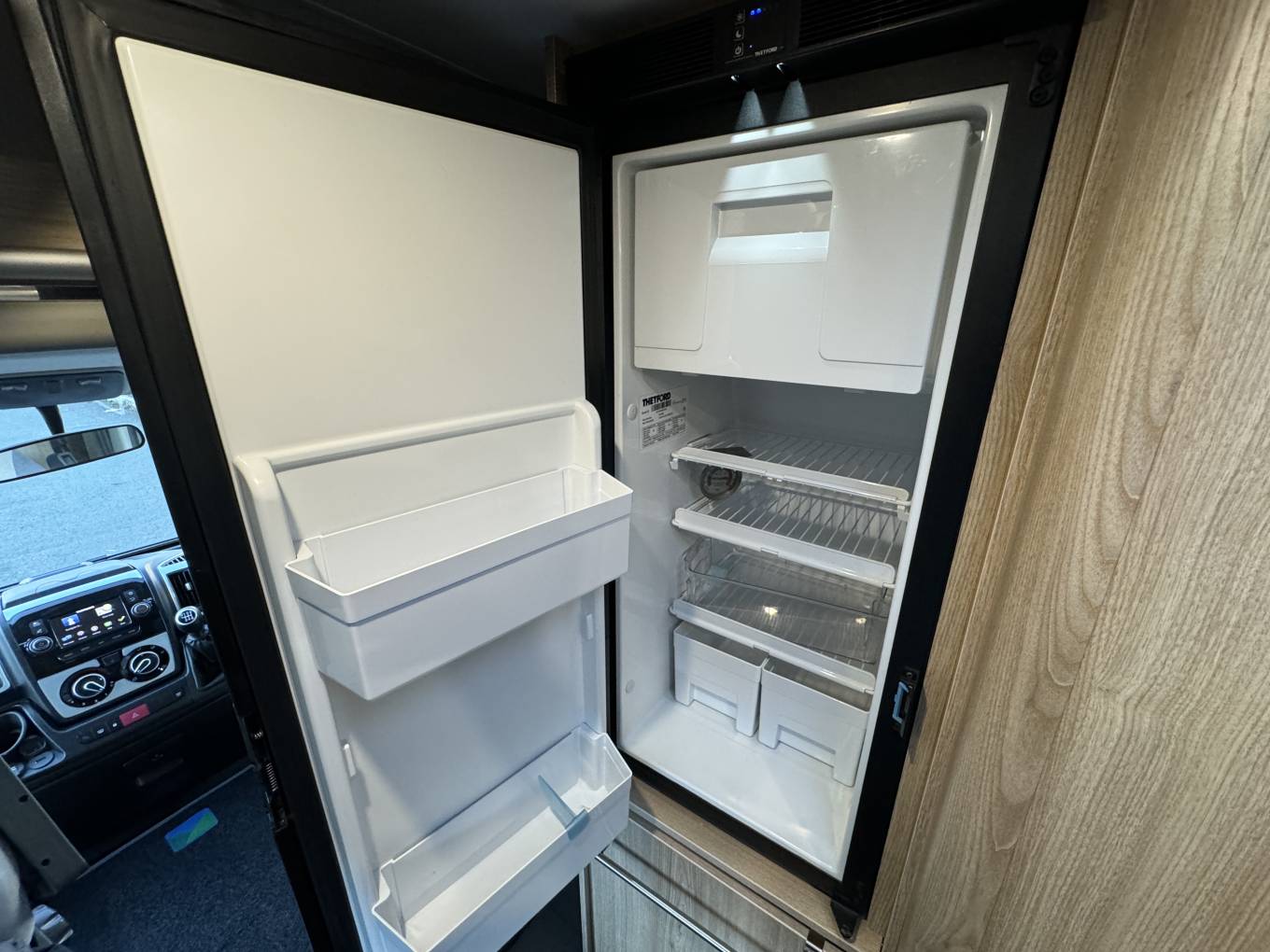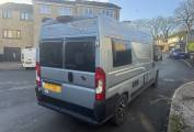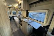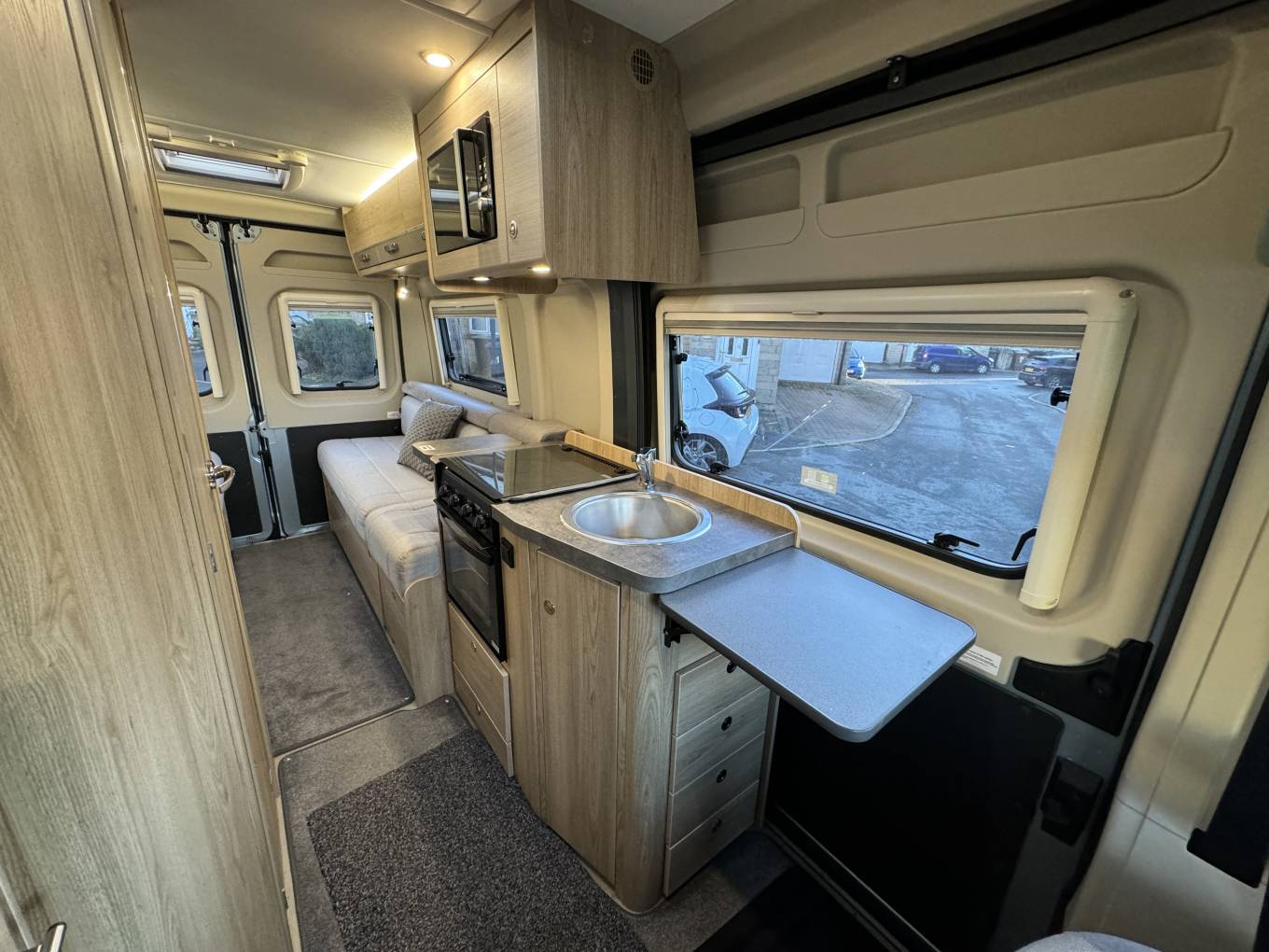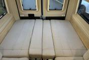 The layout consists of a rear lounge with two side facing sofas can be used as two single beds or one large double bed. You have a mid-kitchen fitted with a three gas burner hob, a gas oven and grill, a sink with a mixer tap and a three-way fridge with freezer compartment. A fold out shelf gives you additional work space when preparing food. Both of the front seats swivel to allow for people to dine in comfort.