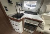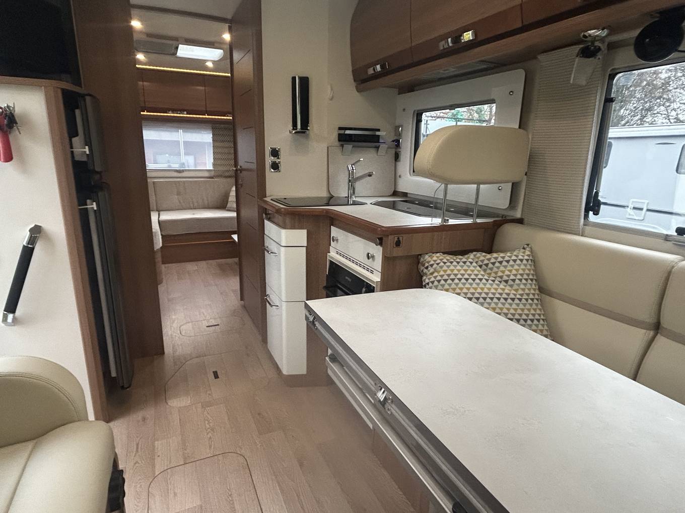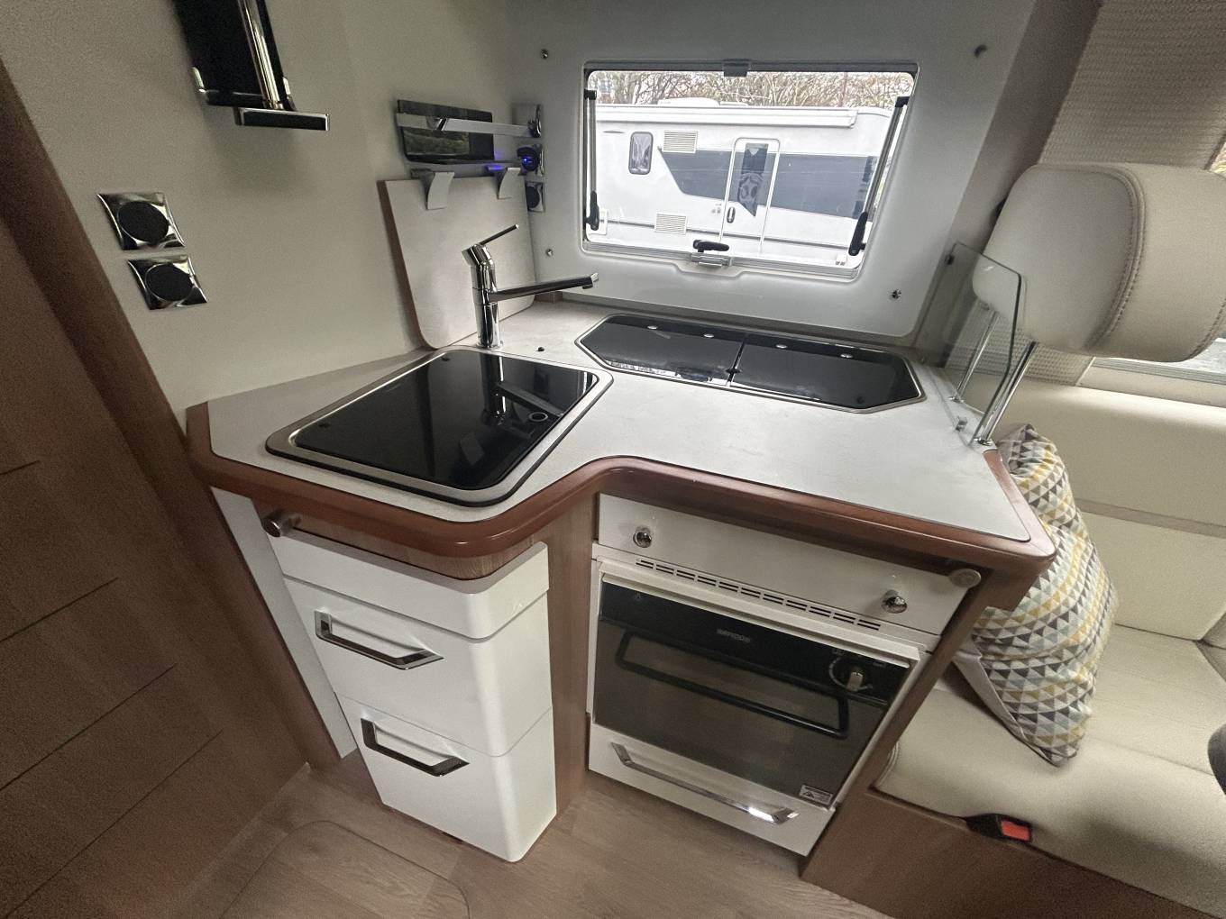 The living area on this 8094DF is superb and offers the perfect place for a couple to spend time away. At the back of the motorhome you have an excellent spacious L-shaped lounge, the perfect place to put your feet up and relax. At the front you have a further seating area that makes use of the two front captain's chairs and two side facing sofas - all in cream leather - giving the choice of where you want to relax. The front area has a large folding table that is ideal entertaining or even browsing a tablet or laptop. The motorhome comes with a TV and has a further tv point in the rear lounge, has 5G wifi and there is a fabulous surround sound system. With LED lighting throughout and built in mood lighting in the rear lounge it is a wonderful motorhome to actually spend time in. There is a well equipped central kitchen that has all you need. This includes an oven, grill, gas hob with 3 burners, sink and large fridge with separate freezer.