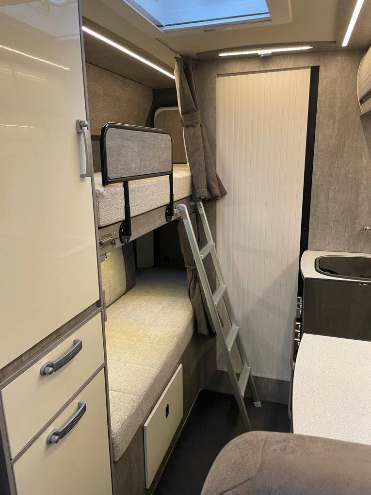 to the rear, 2 bunk beds, each with their own privacy curtain, night lights and