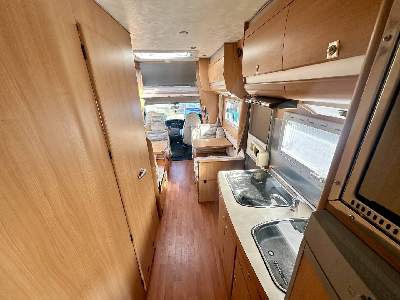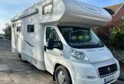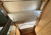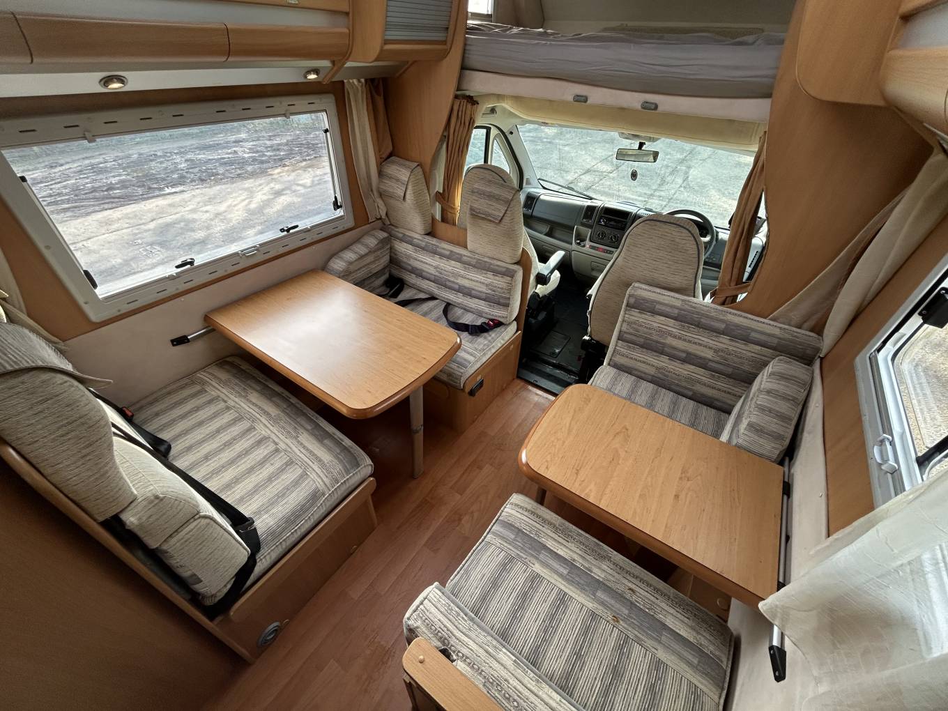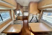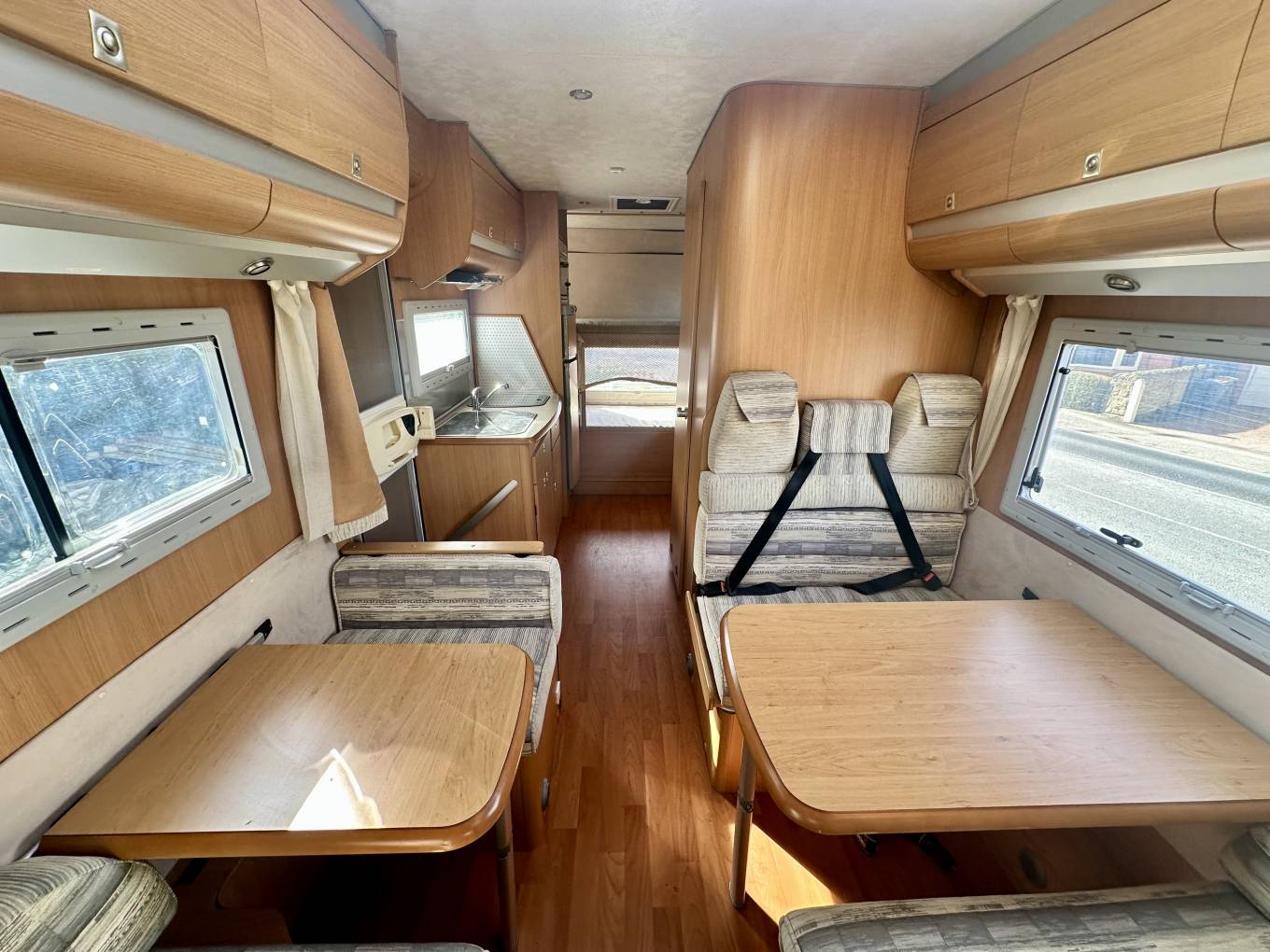 At the rear of the motorhome, you will find bunk beds including one bed that can be lifted in transit to create a large rear garage for storage with enough space for bikes and everything you will need for that relaxing family holiday. Moving forward you will find the practical washroom which has everything you need to keep yourself fresh on your travels including a separate shower, wash basin with a mixer tap, a Thetford cassette toilet with electric flush, a vanity cupboard and a mirror. Adjacent to this is the well equipped kitchen area including 3 burner gas hob, grill, oven, a full sized fridge freezer and plenty of storage. In the heart of the motorhome you will find the spacious dinette area which comfortably seats up to 6 people, perfect for entertaining or relaxing. As the night draws in this area converts to a single and double bed. Above the cab you will find another comfortable double bed completing this 7 berth motorhome.