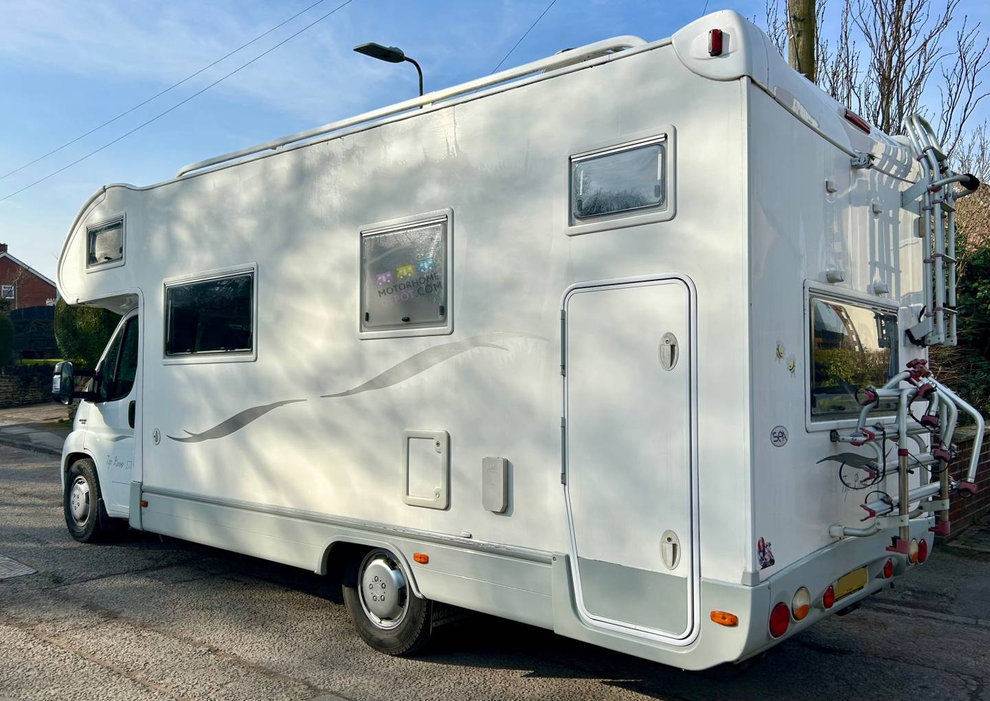 Additional features: uprated 3.0 engine, cab air con, cruise control, wind out awning, alarm, reversing camera, ladder, roof rail, bike rack.