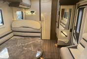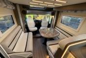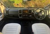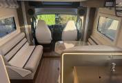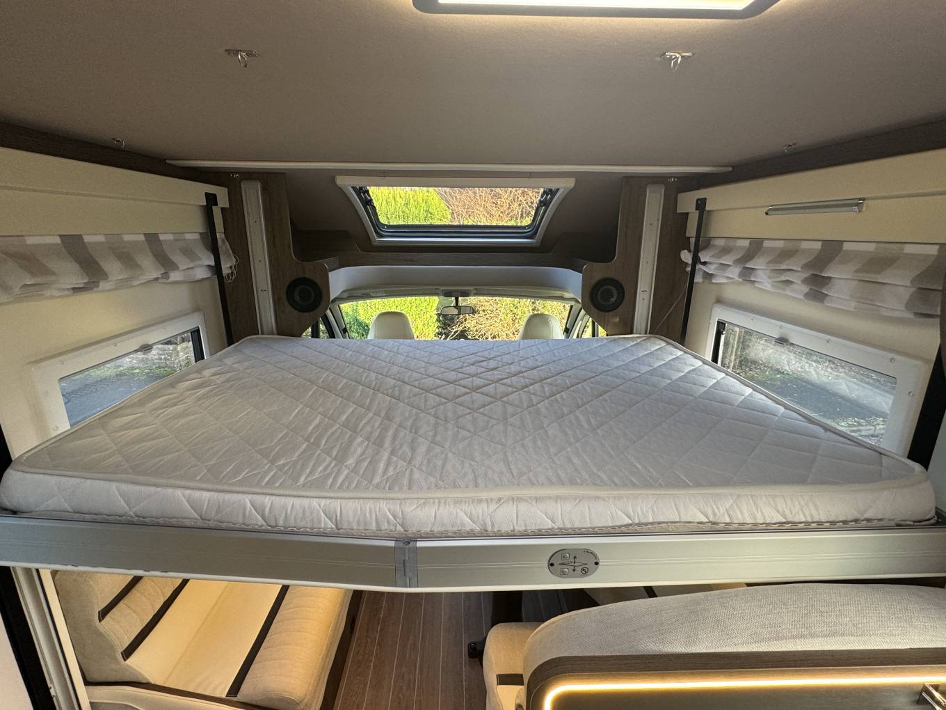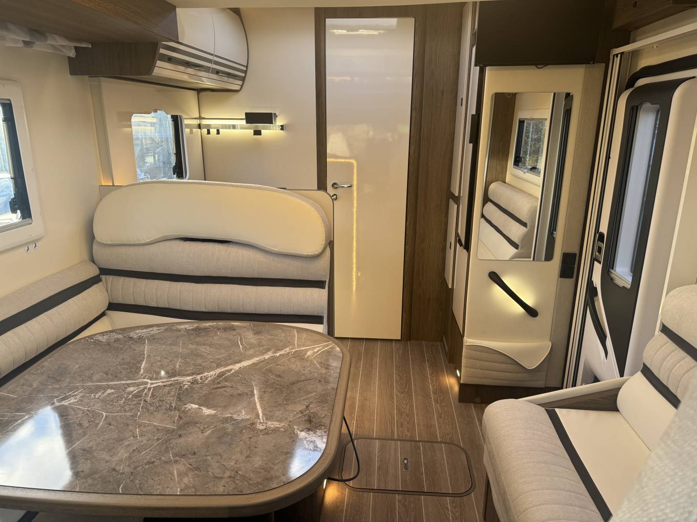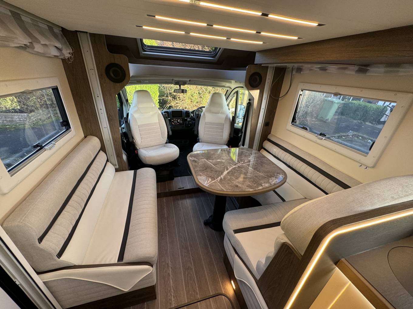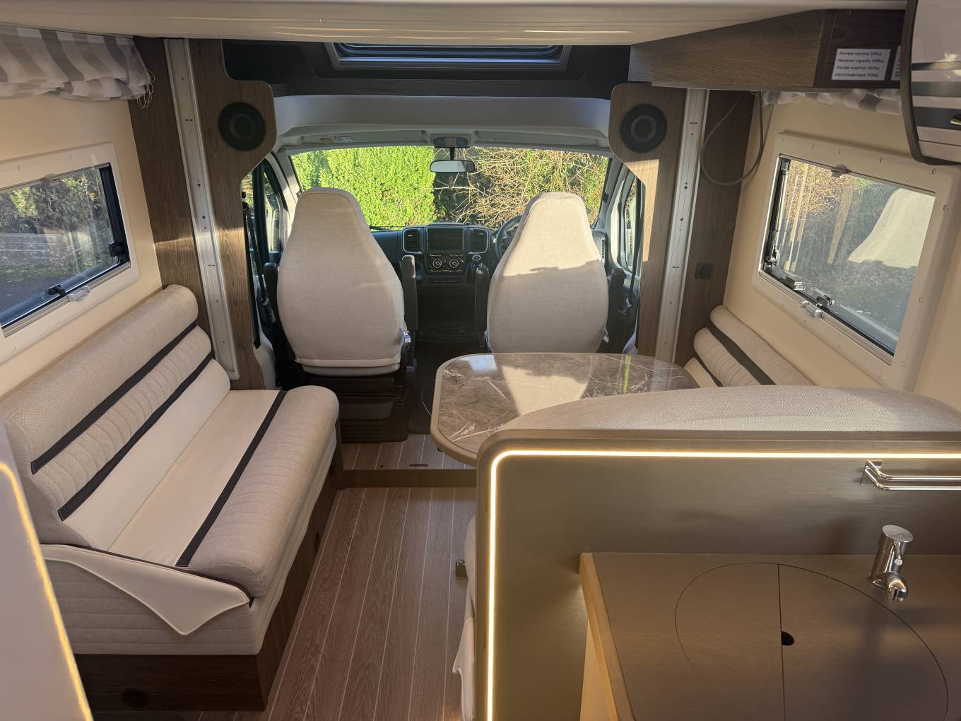 As we move to the front, check out the stunning LED lighting that brings the space to life! The lounge/dining area is super inviting, featuring rear travelling seats and a cozy side-facing sofa that transforms into a double bed. Plus, the swivel driver and passenger seats face a versatile dining table, creating that perfect family atmosphere. And don’t forget the spacious electric drop-down bed above which comfortably accommodates two adults!