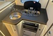 Moving through to the centre of the motorhome, we come to the kitchen area where there is a Thetford Duplex oven and 3 ring gas hob supplied from the gas bottles located in the exterior storage unit. Next to the cooker is the sink with mixer tap and opposite is the full length Therford 3 way fridge with freezer compartment and chiller drawer.