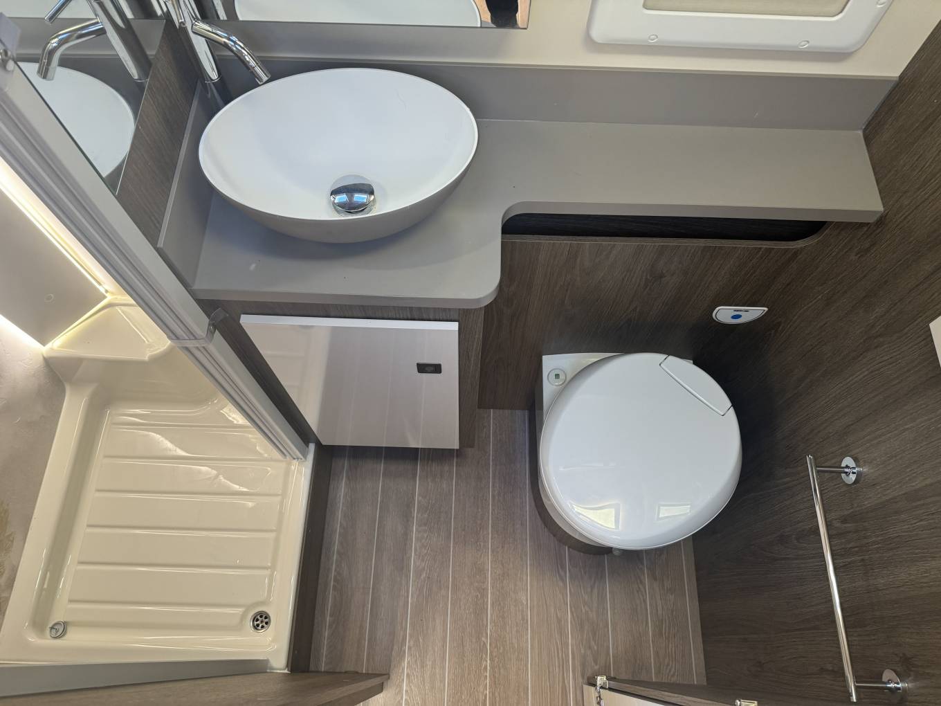 At the rear, you’ll find a spacious washroom that features a full-length separate shower, a stylish wash basin with a mixer tap, and a separate Thetford toilet – complete with handy storage for all your essentials.