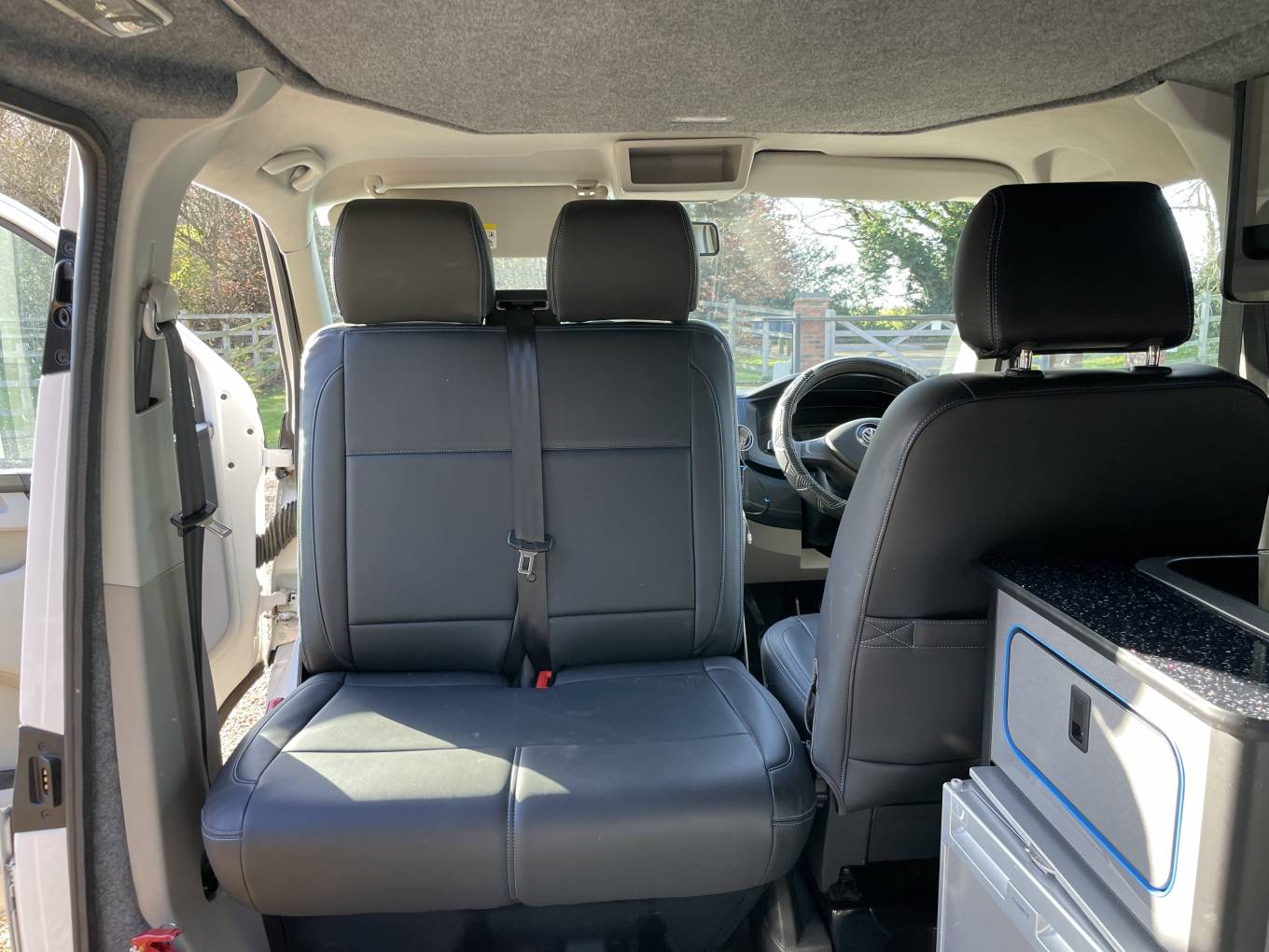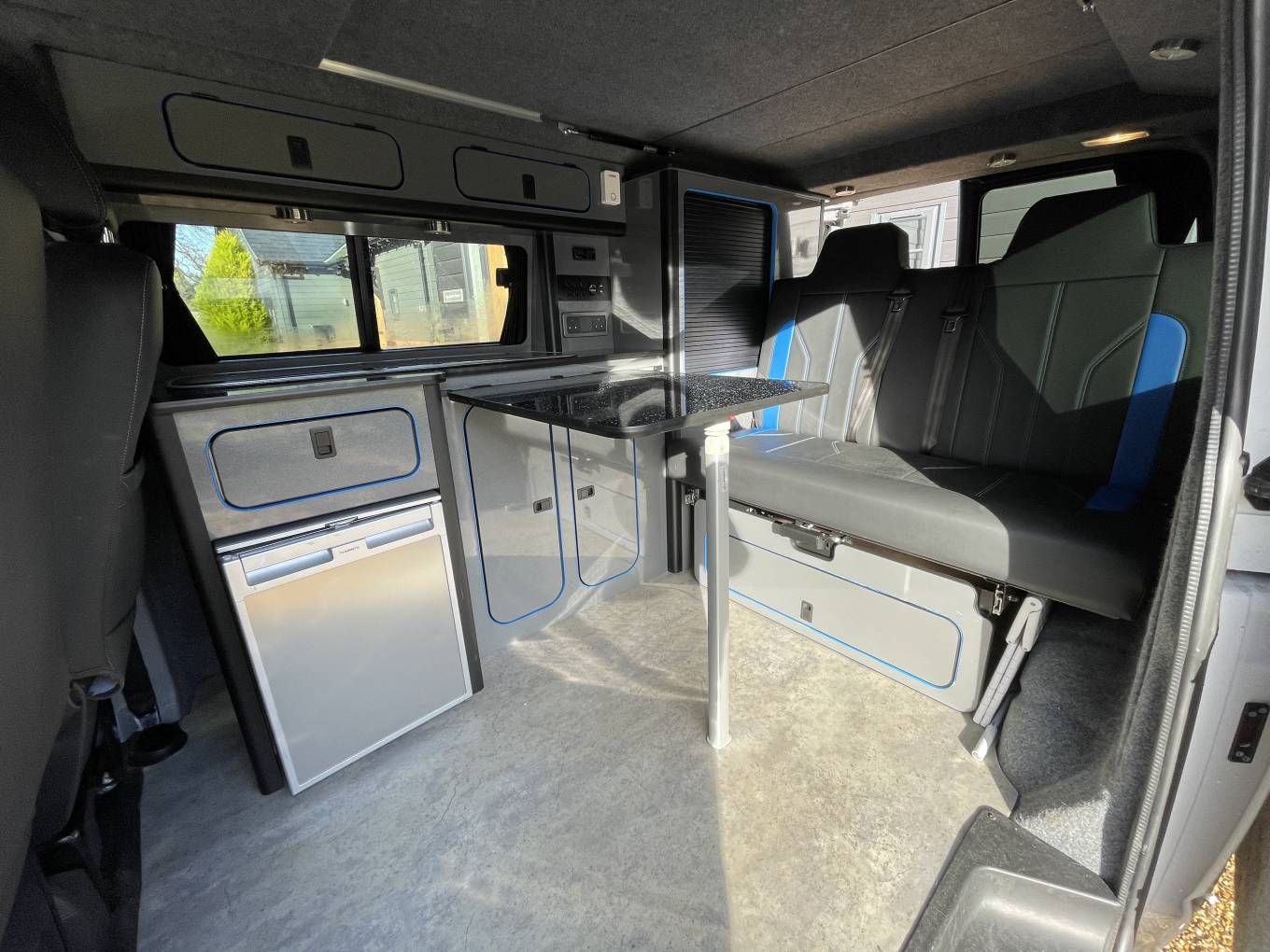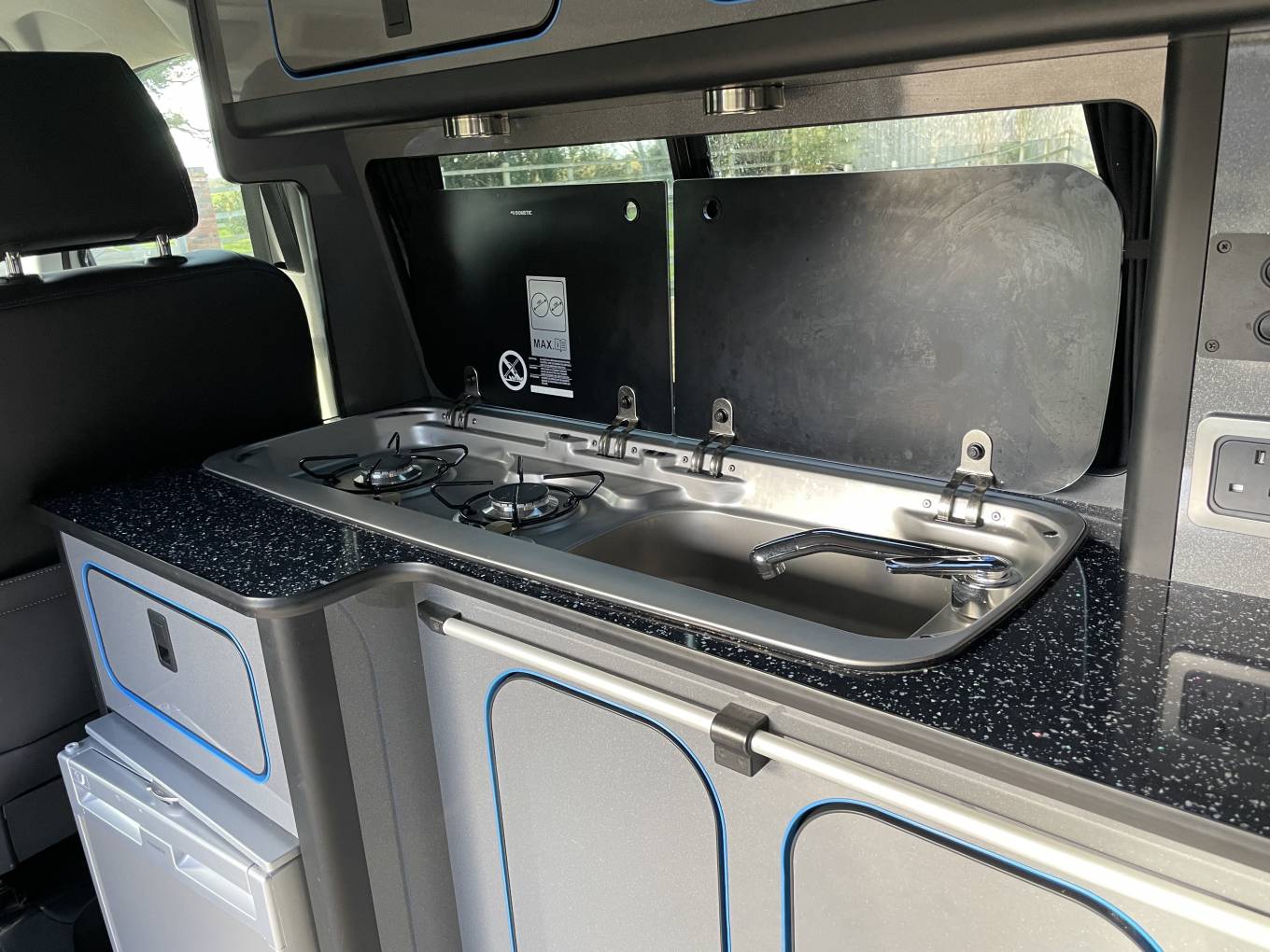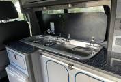 Fully Equipped Kitchen: The camper includes a Dometic fridge, two-burner hob, and a sink unit, making it easy to prepare meals on the go