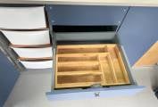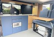 The light blue and pine wood cabinets provide a stylish, cozy aesthetic, making this van a true home on wheels.