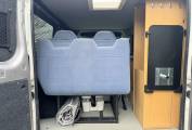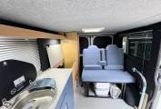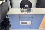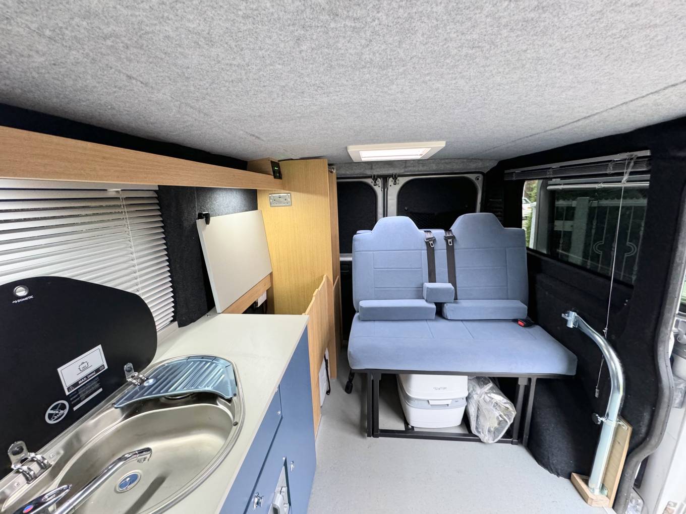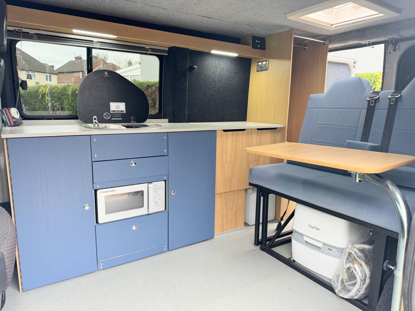 Inside, the camper features 4 travelling seat belts, a swivel passenger seat, and a functional dining setup with a table. The kitchen includes a circular sink with a single hob, a microwave, and vented space for a fridge or cooler (not included). There’s also a Porta Potti that stores neatly under the seating area along with silver screen.