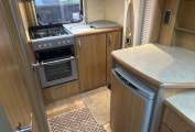 The 630 EK has a great layout for a couple or single person. At the front you have a large spacious lounge area that makes use of the two captains chairs and two large side facing sofas. The motorhome also has a free standing table that can be place in the centre to give you the ideal place for a meal, snack or even a game of cards. Moving to the back of the motorhome you have a well equipped end kitchen with plenty of space to prepare your meals. This includes an oven, grill, duel fuel hob with 3 gas burners and electric hot plate, sink with mixer tap and 3-way fridge with ice compartment.