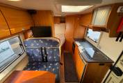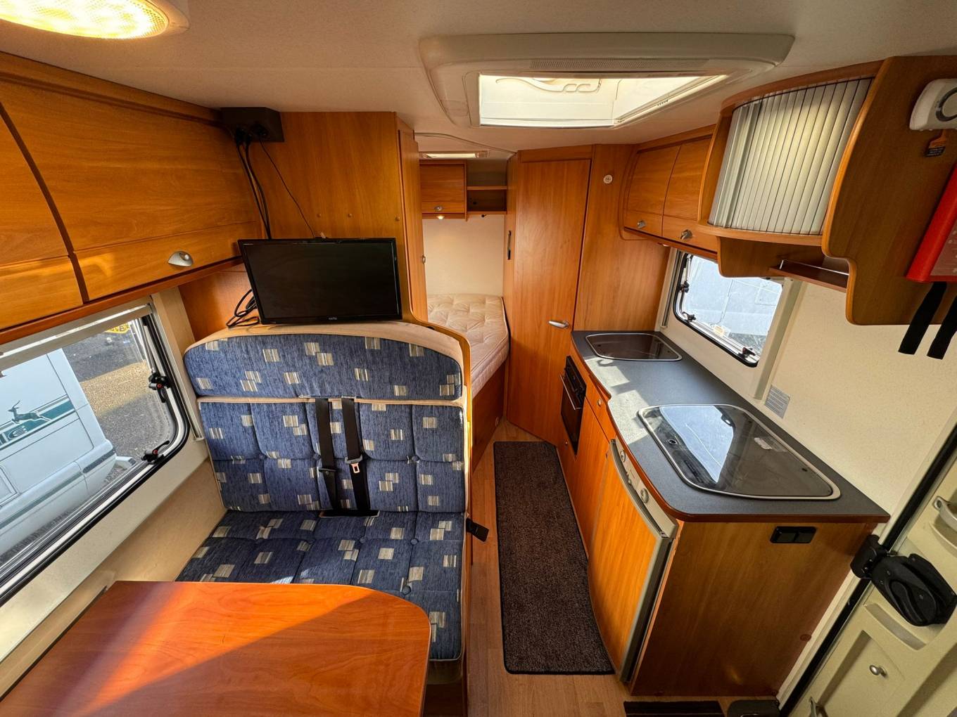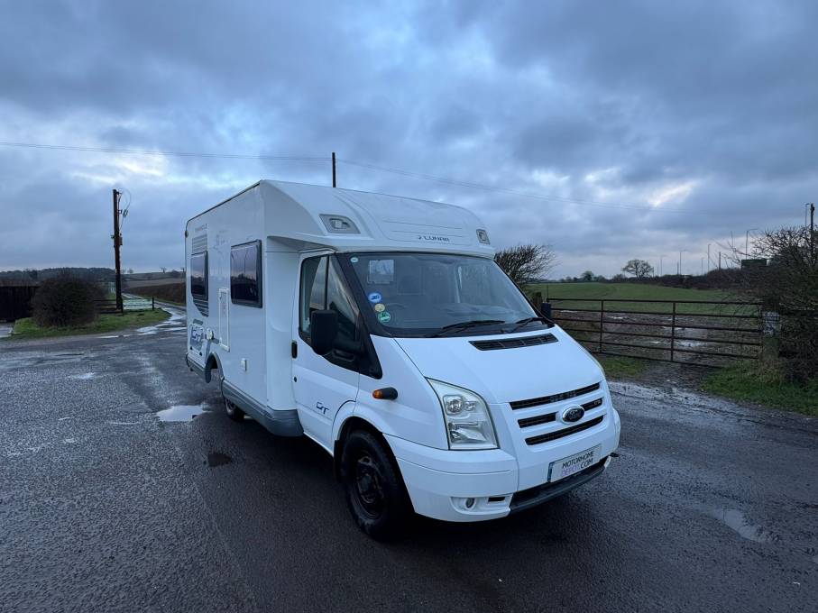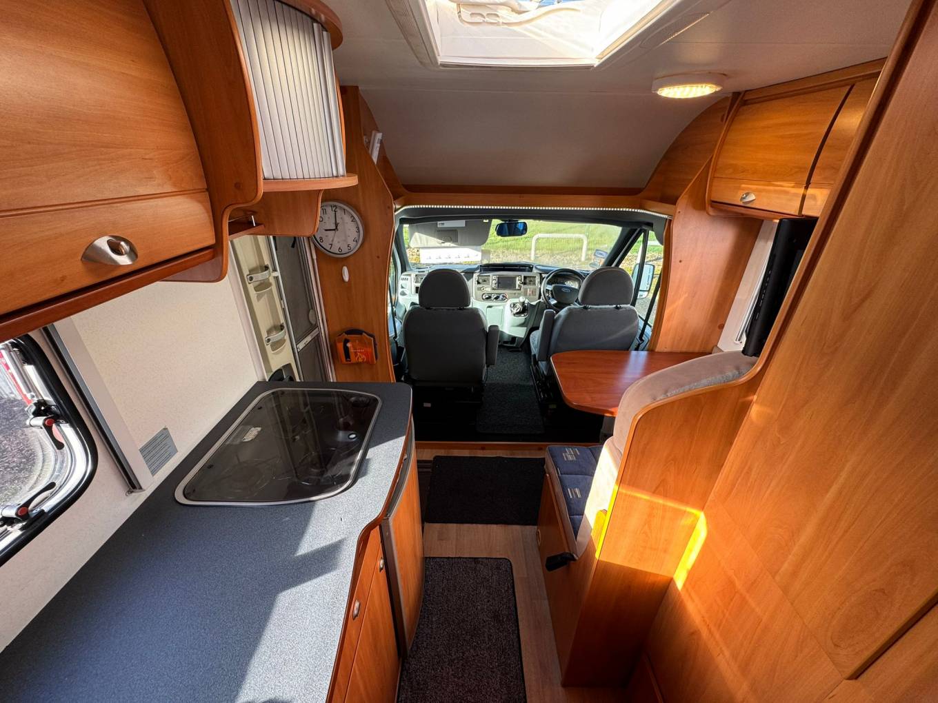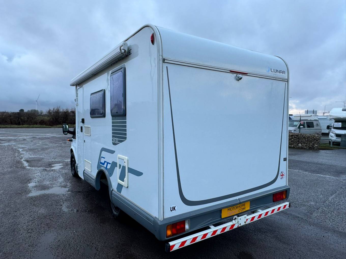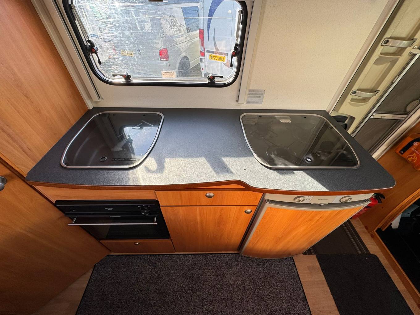 This 2008 Lunar Pinnacle GT on a Ford Transit 2.2 TDCI Diesel with 5 speed manual gearbox. Step inside and you have the kitchen on your right, with a stainless steel sink with chrome mixer tap and glass lid, a stainless steel hob with three gas burners and a glass lid, gas oven and grill, Domestic three-way powered fridge with ice-box and plenty of upper and lower cabinets to store away your holiday provisions.
