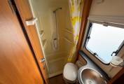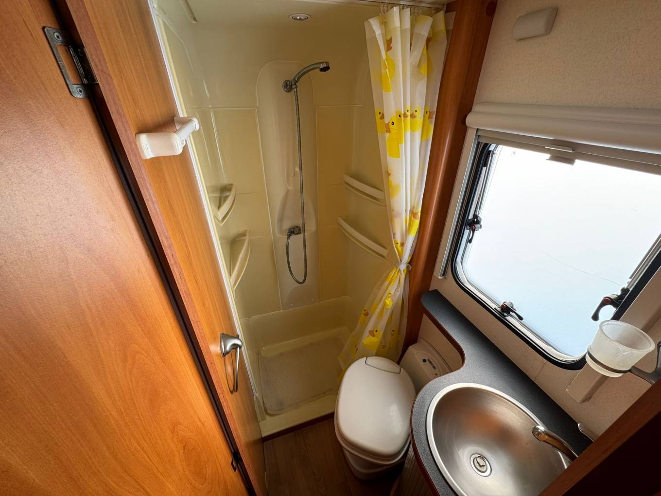 The washroom has good sized built-in washbasin with chrome mixer tap and double cupboard beneath plus a Thetford cassette swivelling toilet with electric flush. Then to the back a separate shower cubicle with shower curtain.