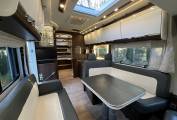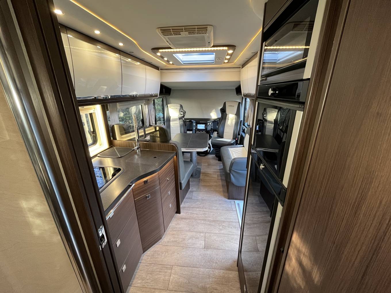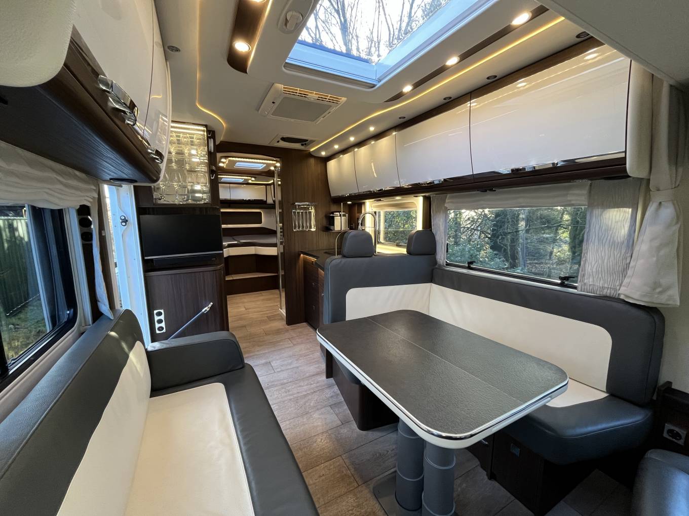 Bi colour leather upholstery with front captain seats . Wall and ceiling in smooth covering , Blinds throughout full motorhome, electrically operated front windscreen blind
