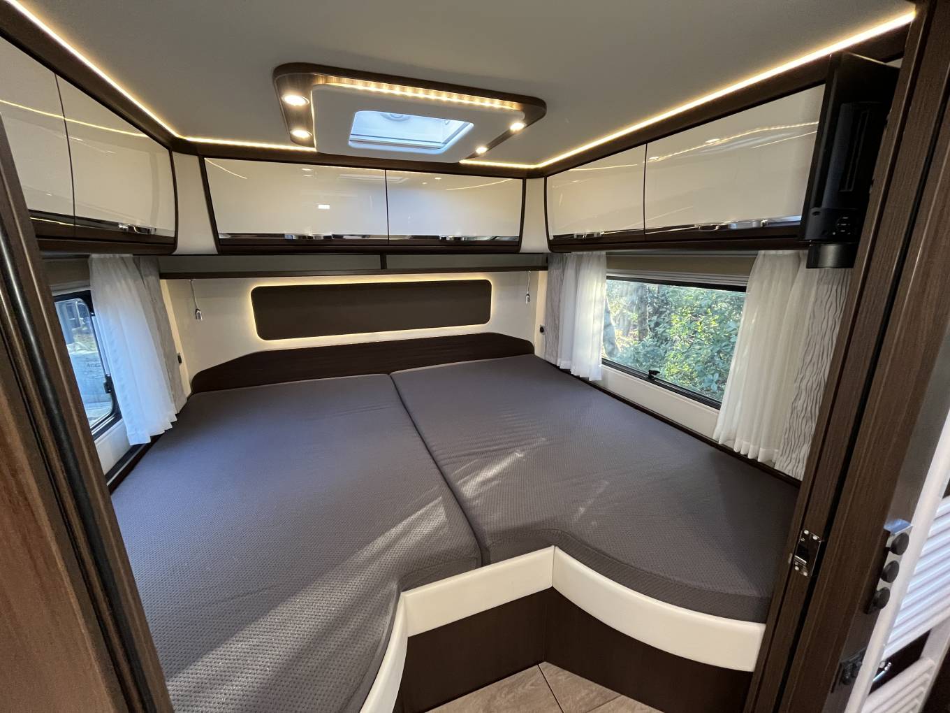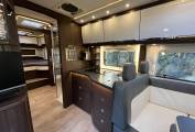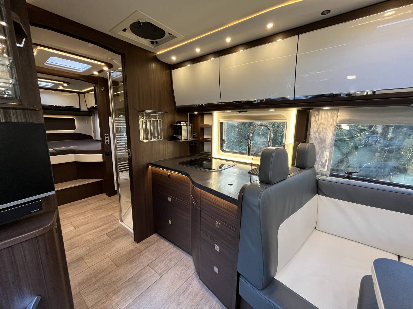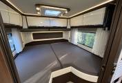 Rear fixed twin bed, Electrically operated front drop down bed, drop-down extendable table with infill for extra 2 berth if required (unused), 6 berth in total