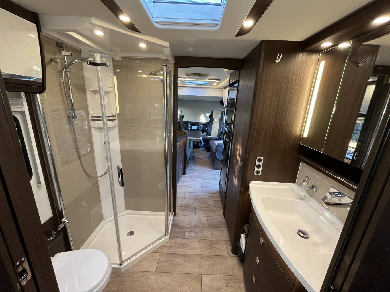 Additional 2 person seatbelts at multifunctional seating bench, Luxury 3 piece bathroom, extensible shower next to toilet, black tank and macerator, grey water transfer pump.