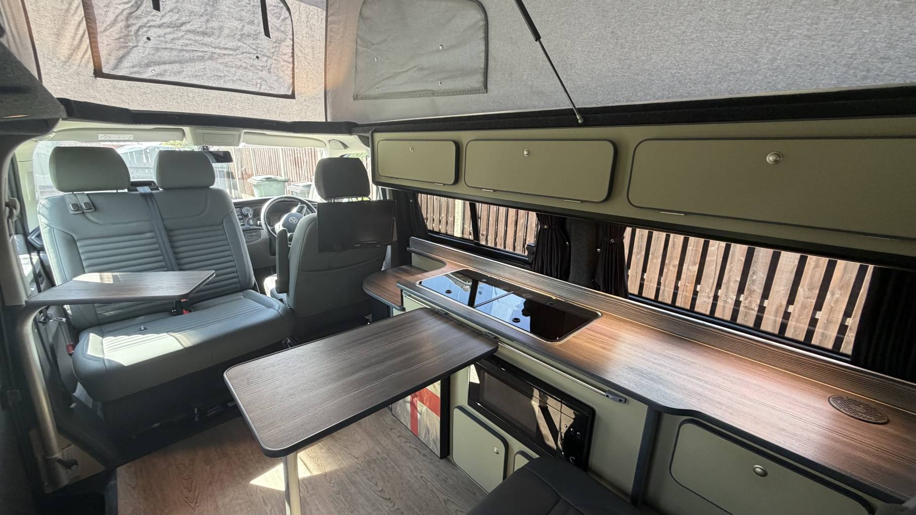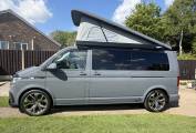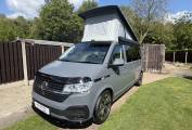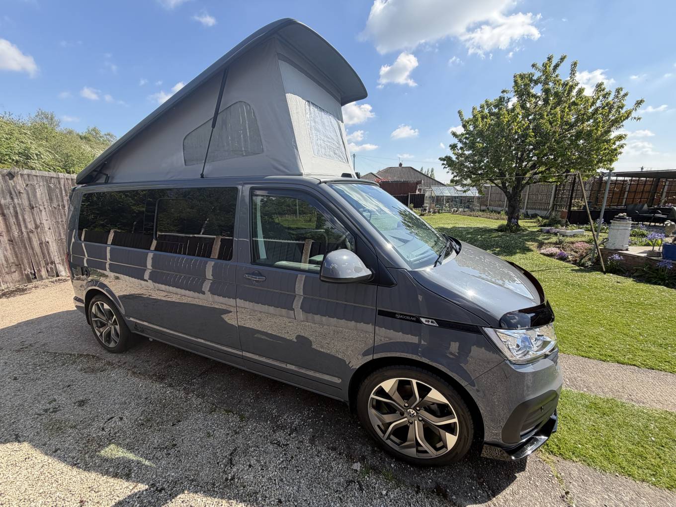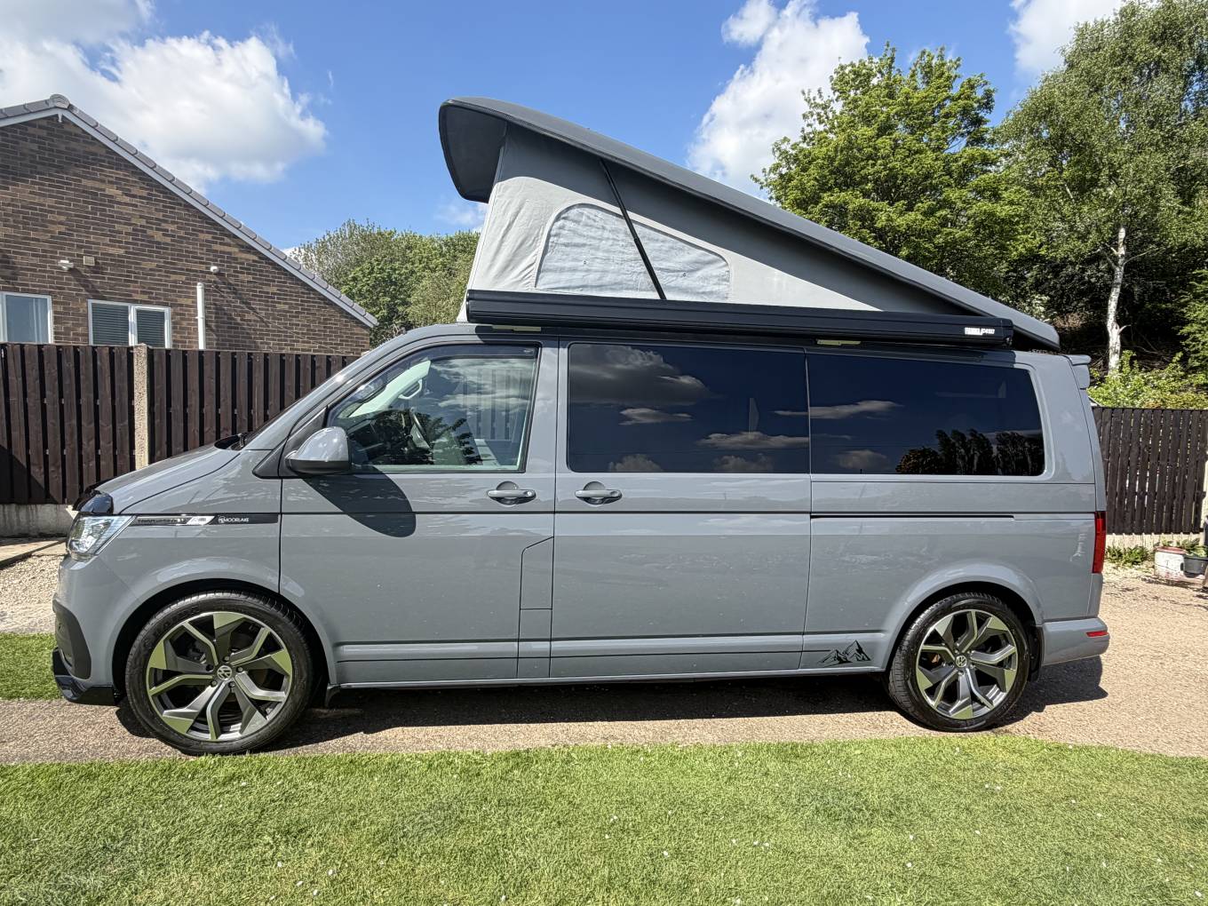 This VW Transporter T6.1, T-28 Highline, professional conversion by camper king, is a real head turner being impressive in Grey . Perfect for families with 5 seatbelts, has low miles and is Euro 6 compliant. The base level includes, 5 seatbelts, pop top, double seat in the cab that swivels, reverse camera, cruise control, cab air con, the kitchen area has 2 gas burner hob, fridge, microwave, sink and mixer tap, two tables, it has a diesel heater, the pop top completes the sleeping area along with the rock and roll bed. It has travelled only 8750 miles and is up to date for service. And has a tracker fitted. Additional features include, alloy wheels, multifunction steering wheel, wind out canopy. It is a LWB at 5.5 metres long, ideal campervan or day van for a family and provide a fantastic VW Volkswagen campervan experience. Part exchange and finance options are available and early viewing is recommended, available to view in Doncaster