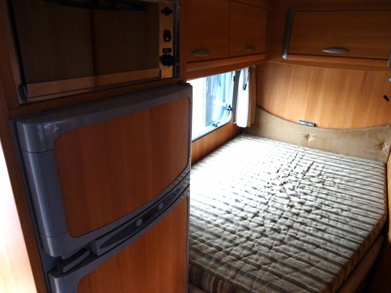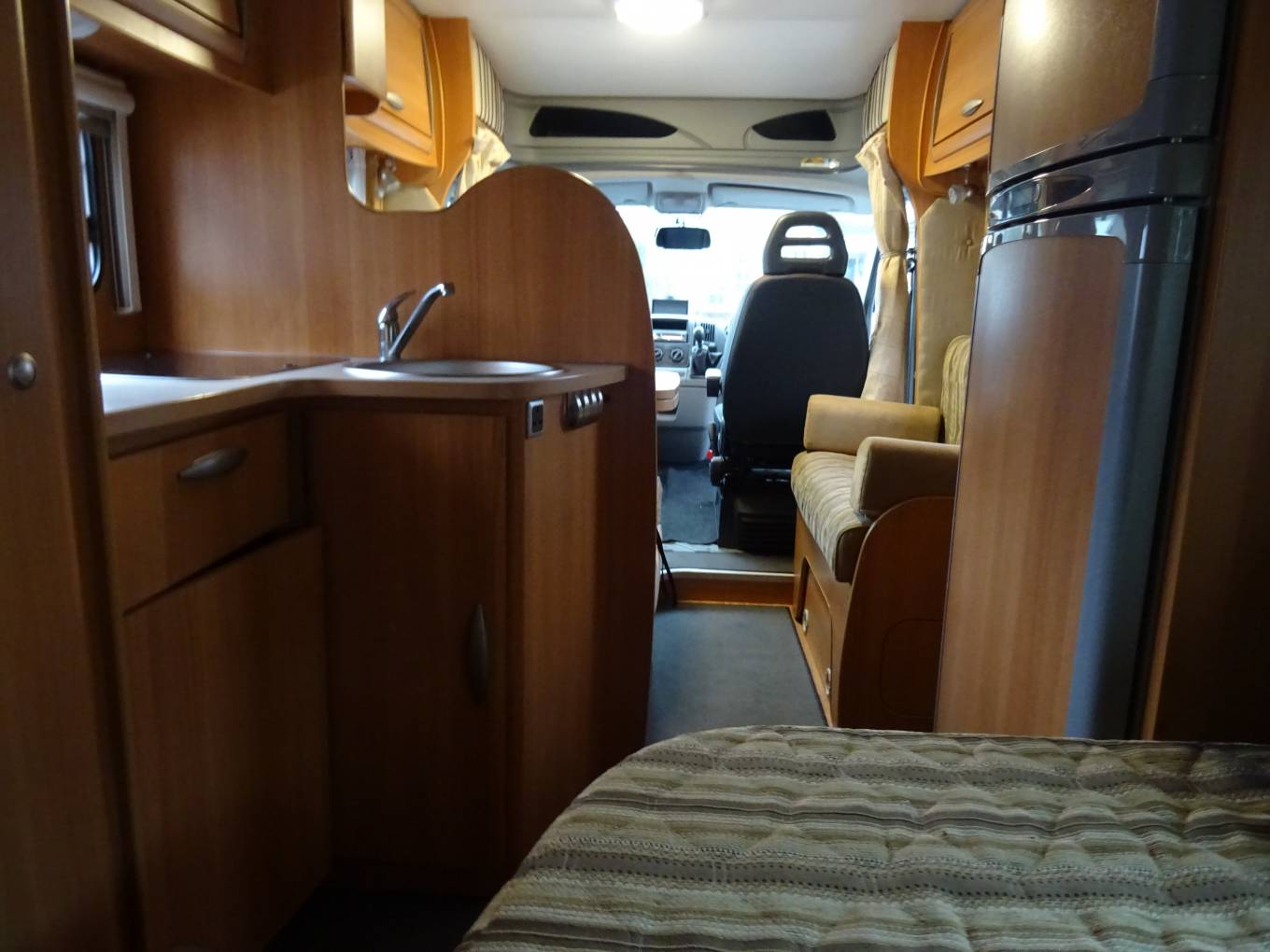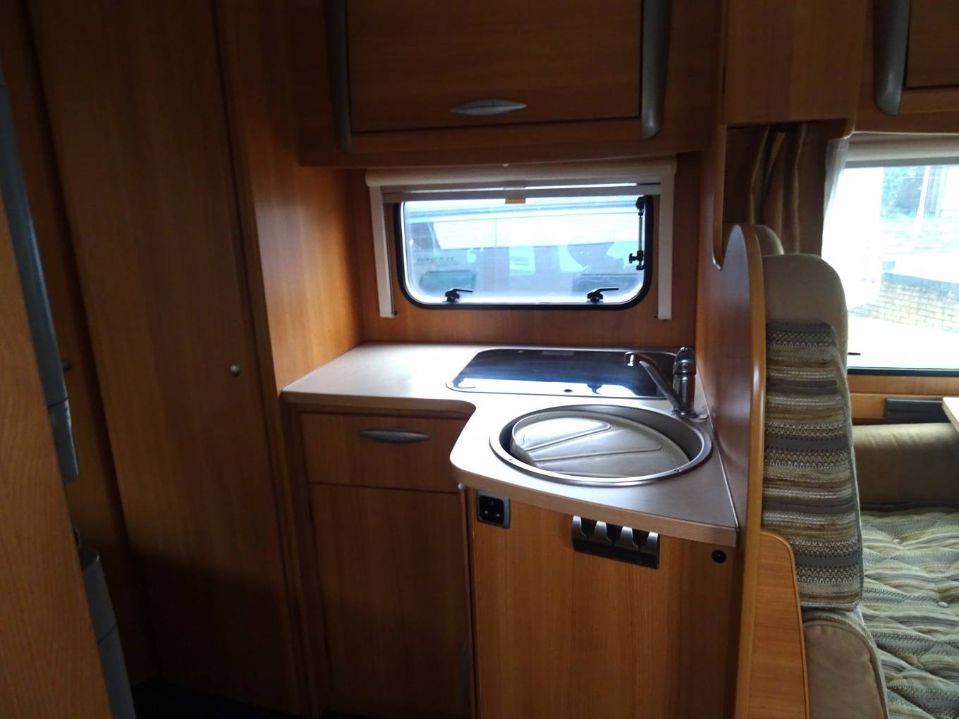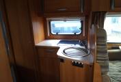 Mid motorhome is the well appointed kitchen with 3 gas hob burner, work service, sink and mixer tap, large 3 way Fridge Freezer and Smev oven/grill.