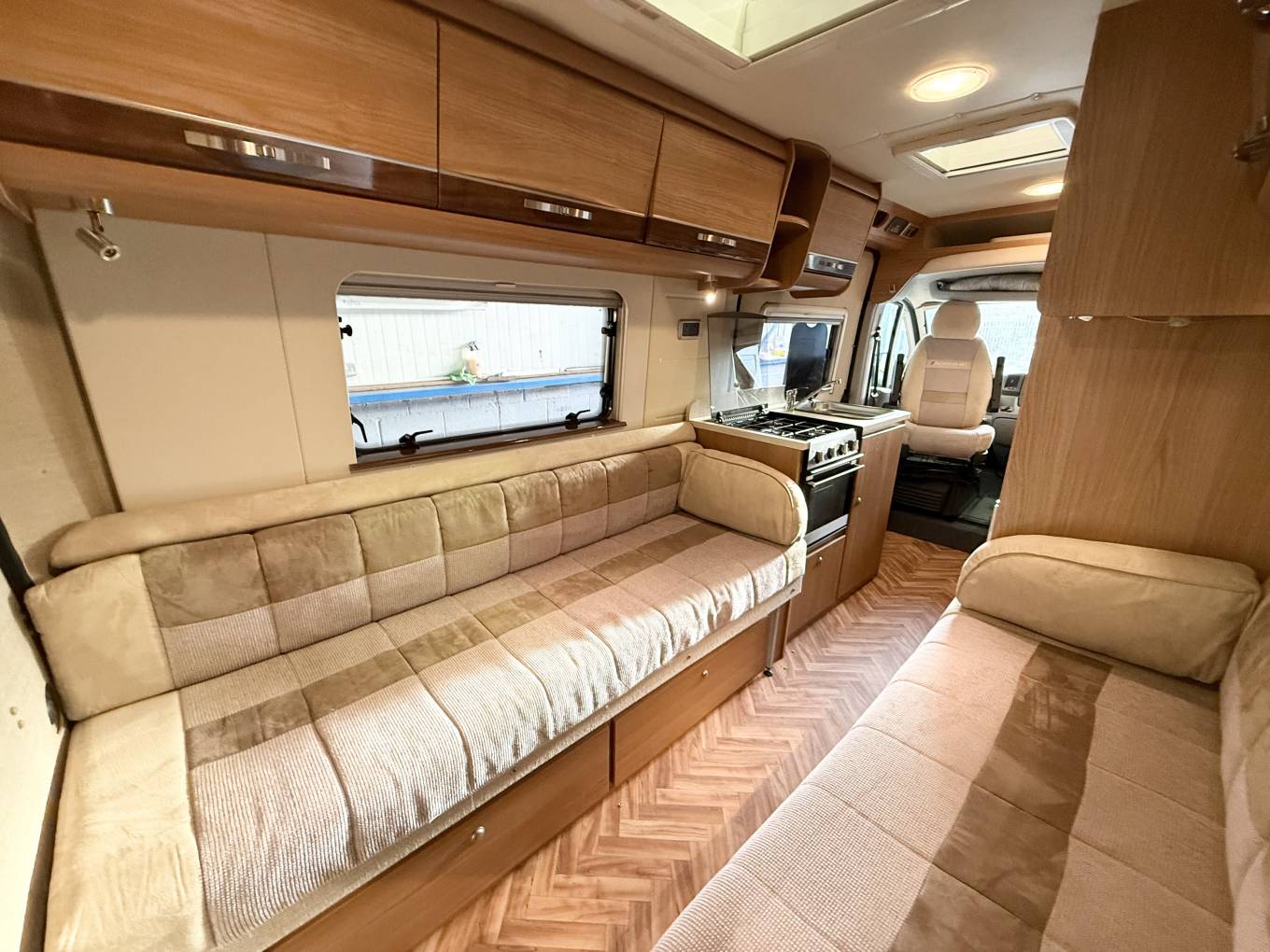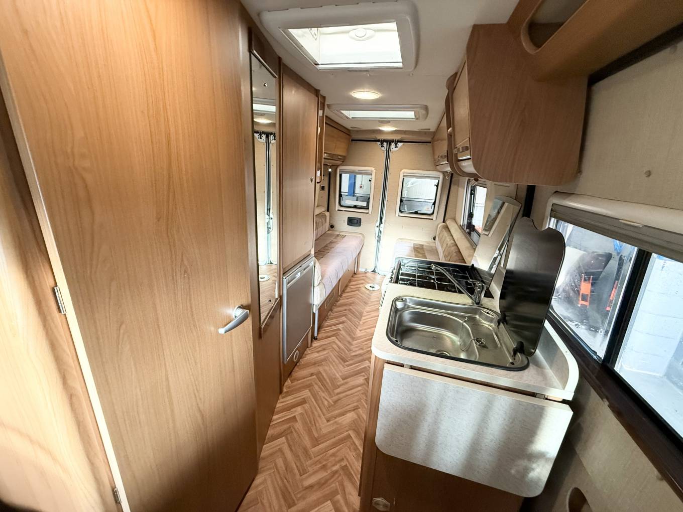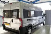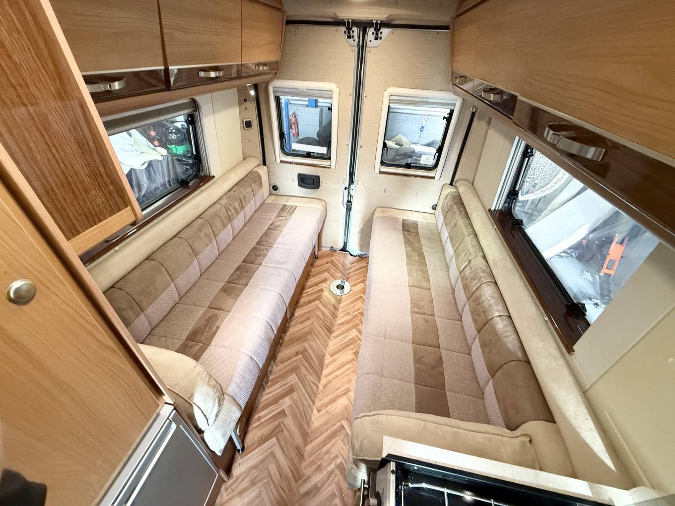 At the rear is the all-important and much sort after lounge with rear opening doors and long, comfortable bench sofas, that face each other, ideal for socializing, stretching out and relaxing or dining. The seating simply slides out to meet each other in the middle, the back rests drop in as infill cushions and the large double bed is up and ready,. Pleated blinds are supplied for all the windows. Moving forward passed the wardrobe space is a well-proportioned well-lit kitchen, which includes a sink with glass cover, the Thetford Triplex hob includes three gas burners and below with combination grill and oven, an extendable worktop. Adjacent is a fridge-freezer and there is plenty of cupboard and overhead locker space. Opposite is the washroom which for this size of van is very impressive. This Motorhome is perfect for so many occasions which explains why its so popular. This Motorhome is packed with extras and for this price range they dont come around often like this.